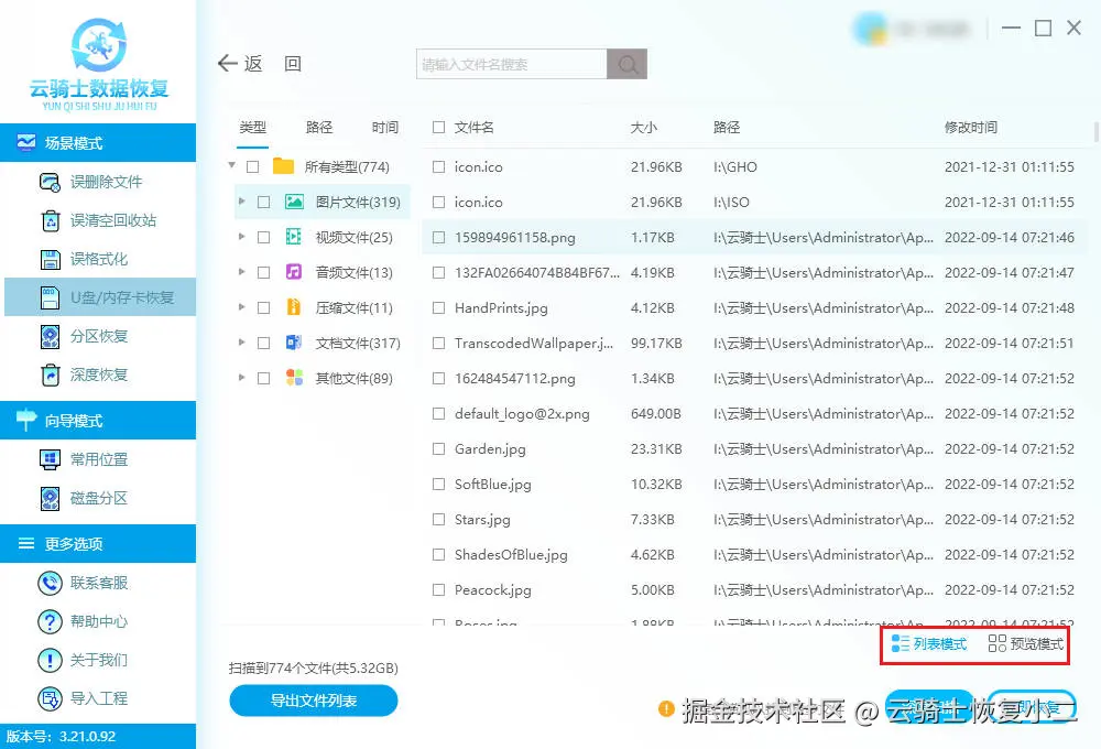 3、扫描完成以后,可通过“列表模式”筛选文件(如按文件类型分类)和“预览模式”预判文件可恢复性。