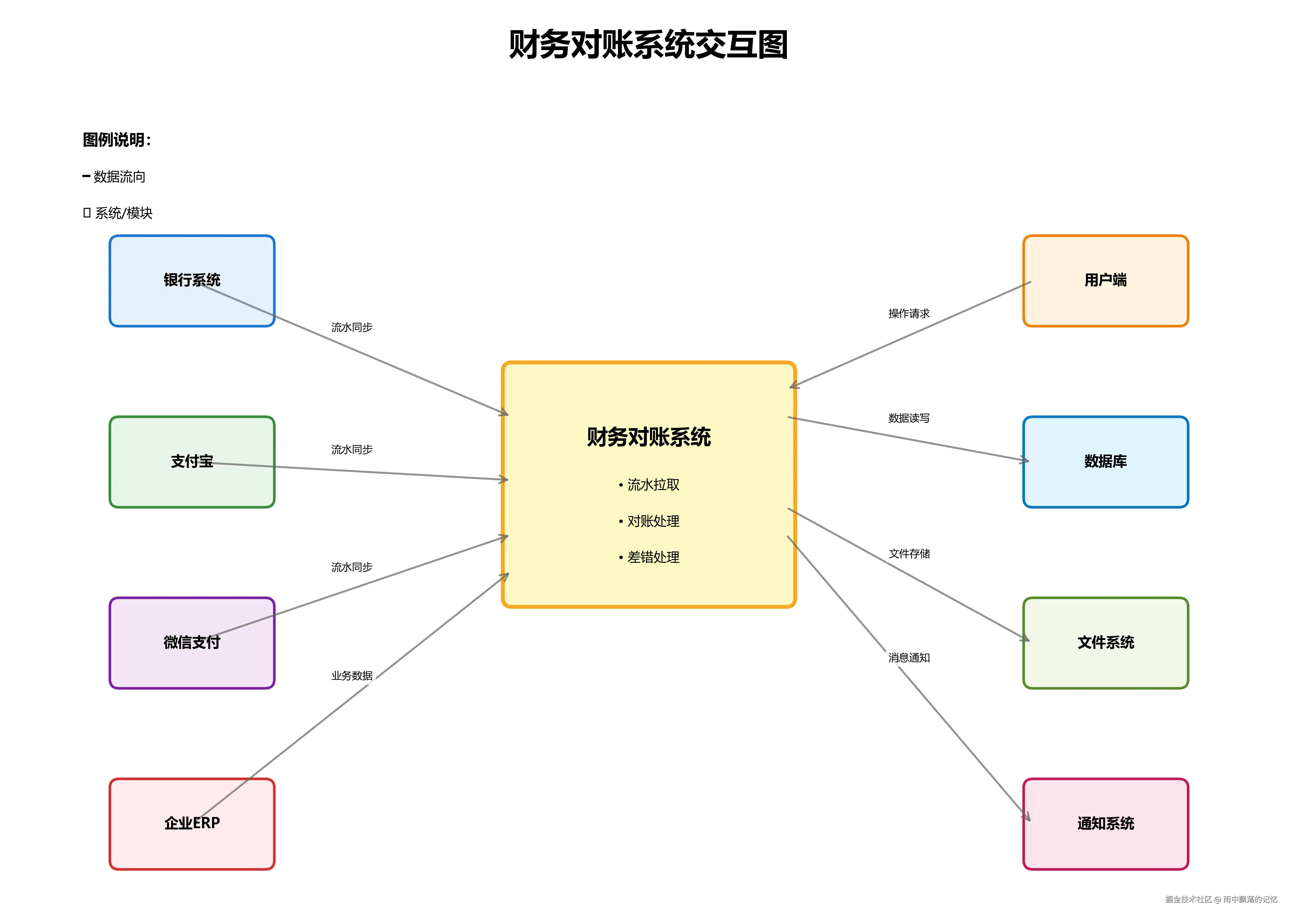 系统与银行系统、支付宝、微信支付建立专线或API对接,实现流水的自动拉取。与企业ERP系统的对接则获取业务订单数据,进行端到端的资金对账。用户端提供人工干预和监控功能,数据库和文件系统确保数据的持久化存储。