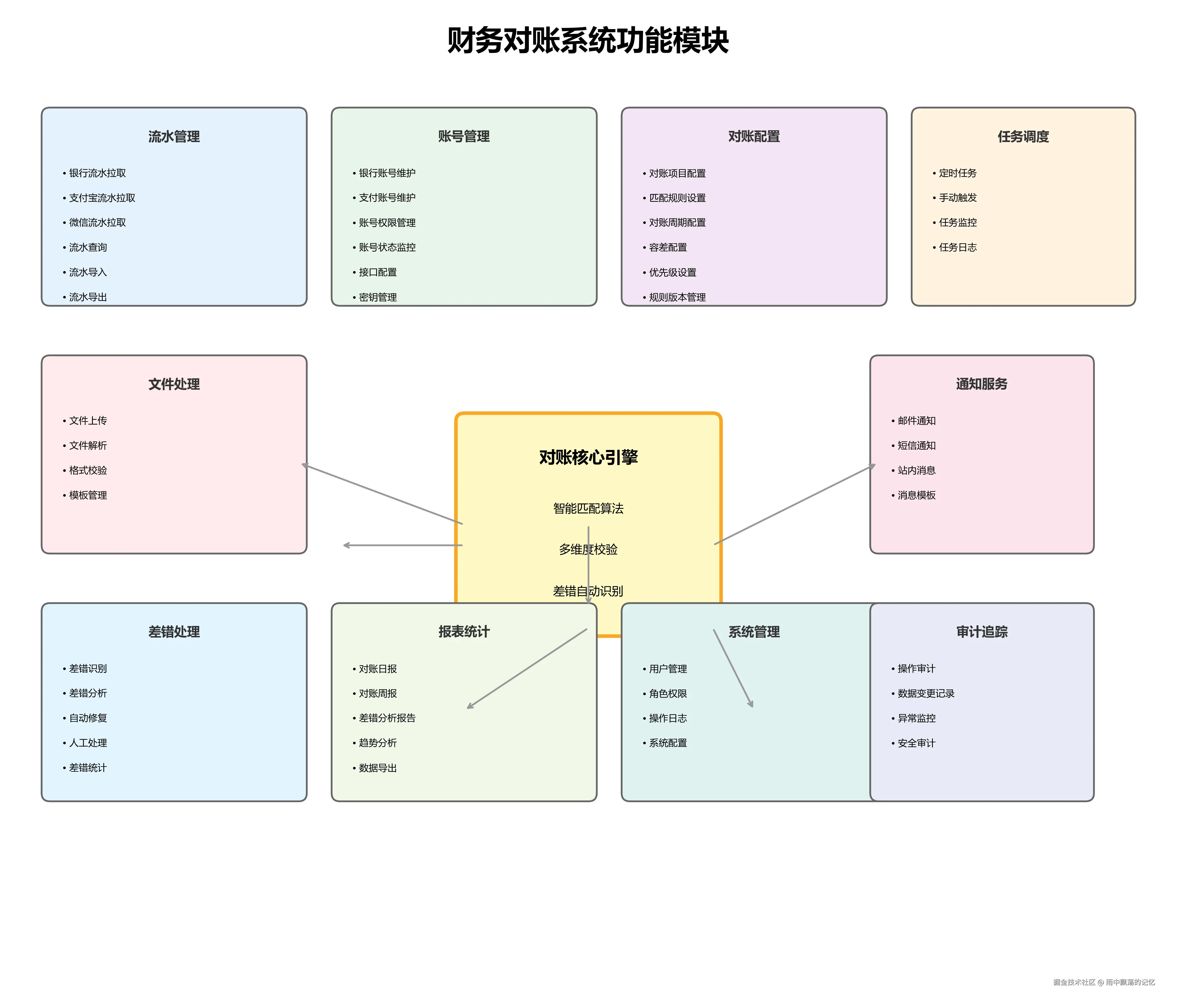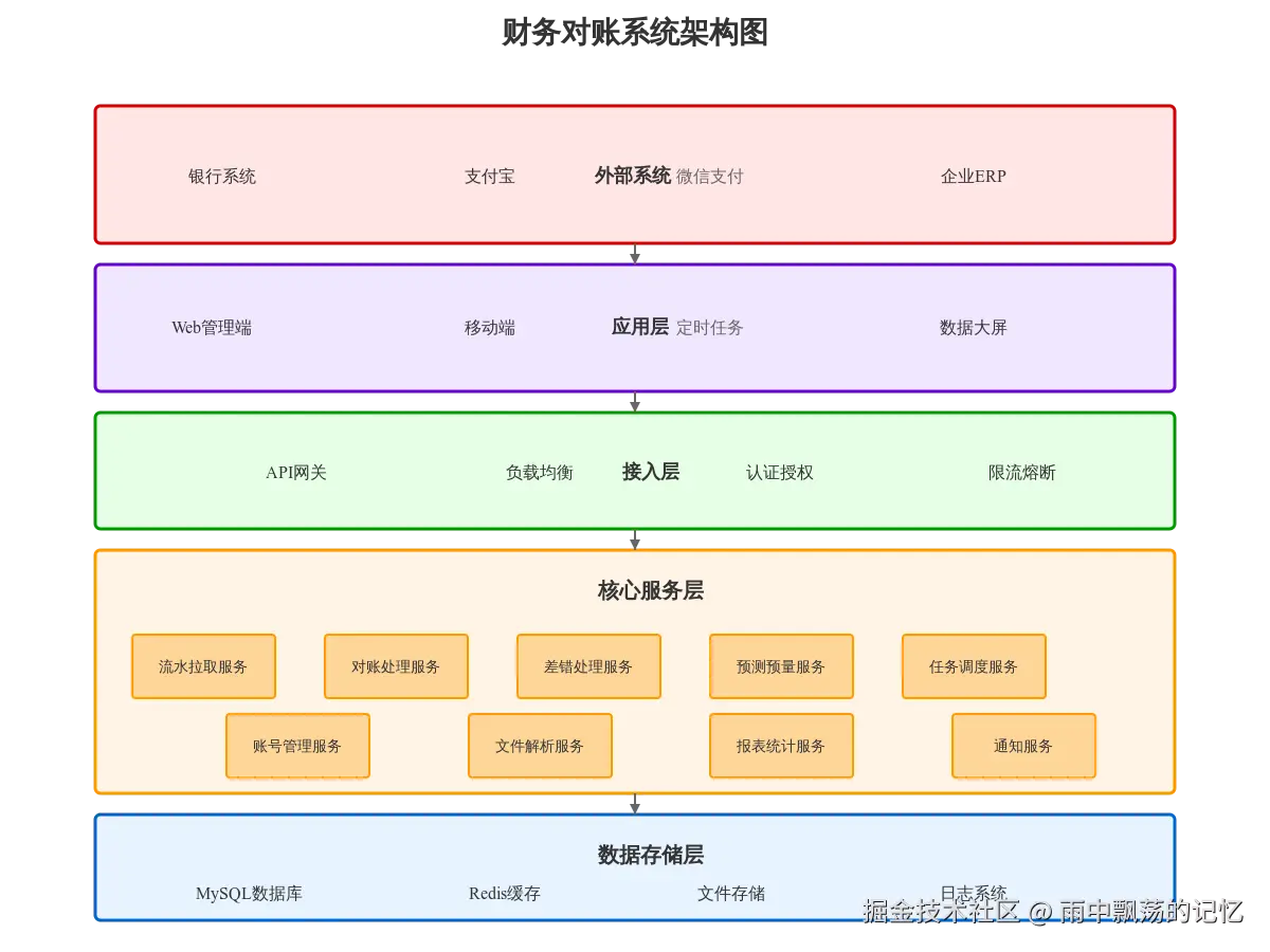 财务对账系统采用分层架构设计,从上到下分为四个核心层次,确保系统的可扩展性和可维护性。