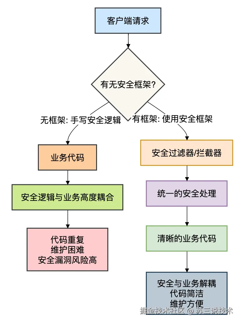 在深入对比之前,我们先要理解:为什么不能自己手写安全逻辑,而非要用框架?