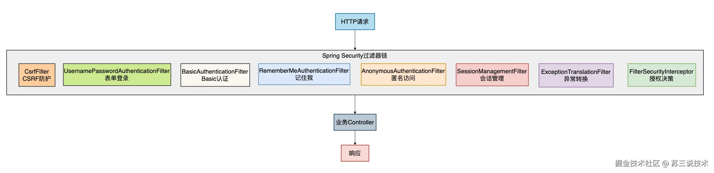 当一个请求到达时,它会经过一系列安全过滤器,每个过滤器负责特定的安全功能: