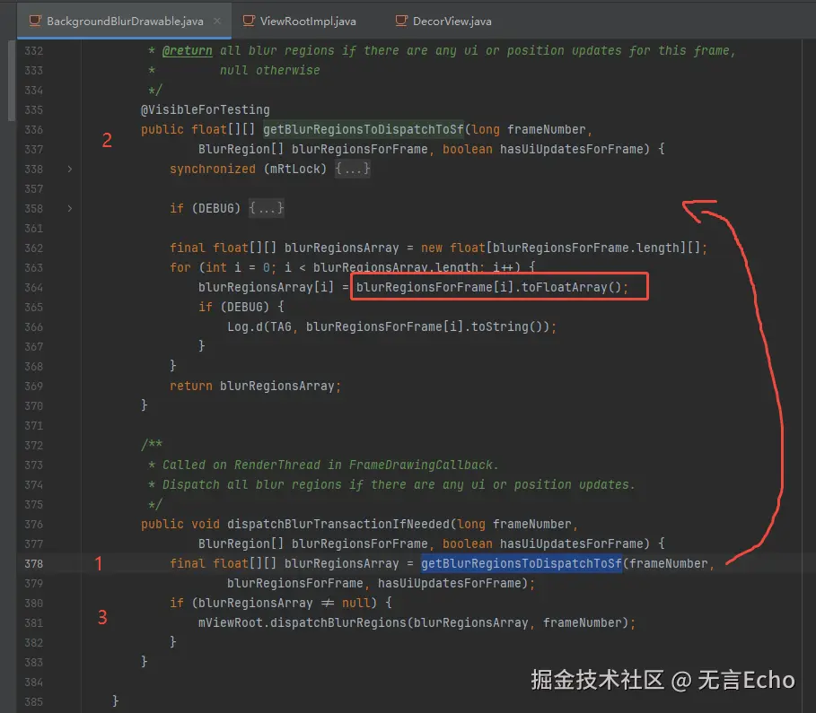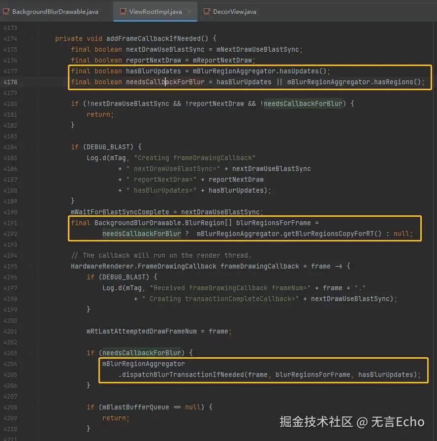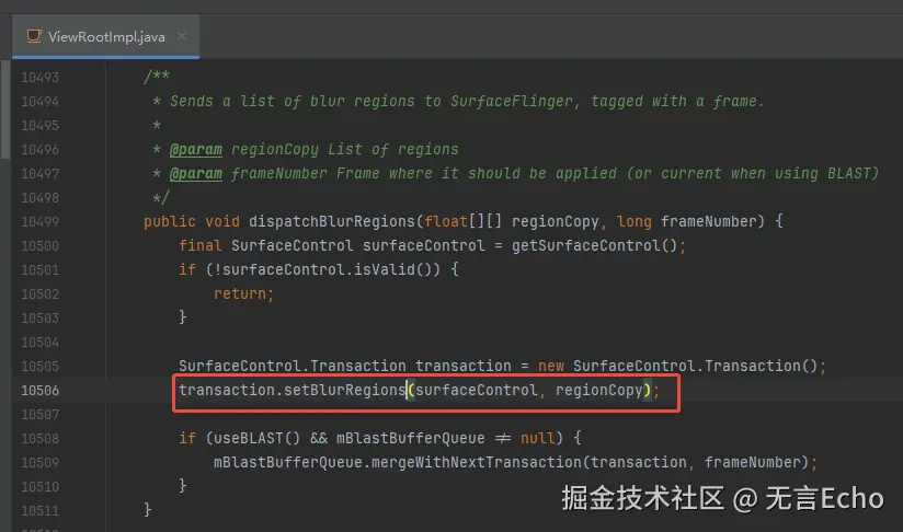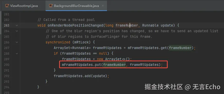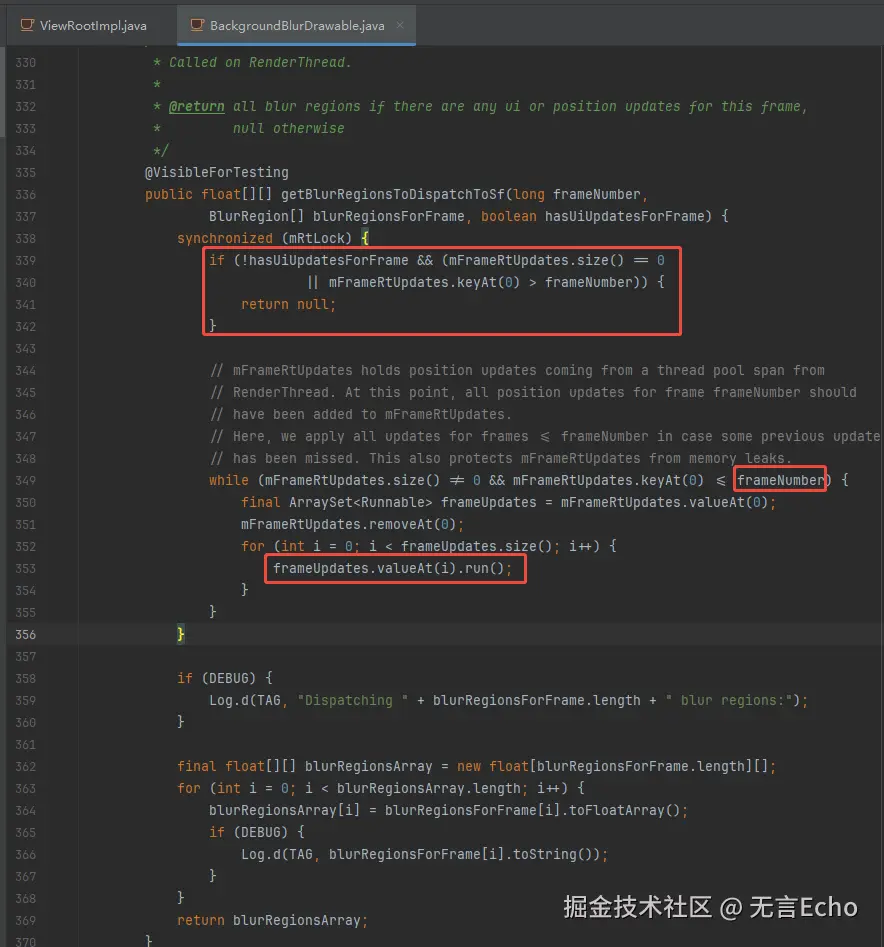 有一个细节是:监听模糊坐标范围mRect更新并没有立即执行,而是作为Runable和帧数一起记下,在getBlurRegionsToDispatchToSf时再真正执行,这样避免了多线程同步问题。