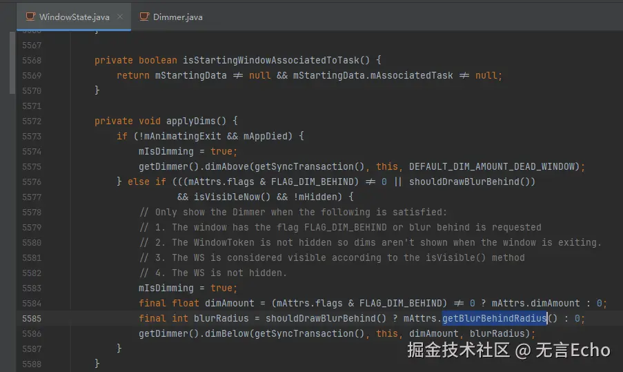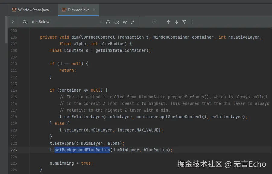 blurBehindRadius参数会传递到system_server端 WindowState中,由Dimmer设置(新建了一个dimLayer),最终是调用