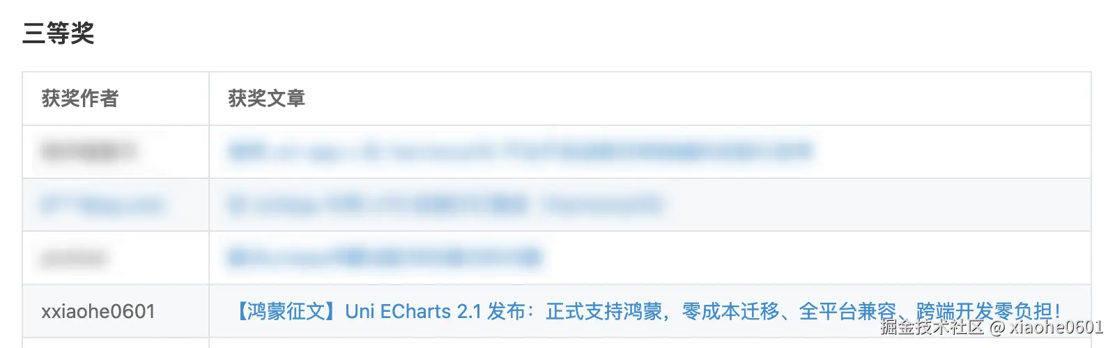 今年为我的 Uni ECharts 项目写了 5 篇分享文章,其中一篇在 DCloud 问答社区的鸿蒙征文活动获得「三等奖」。