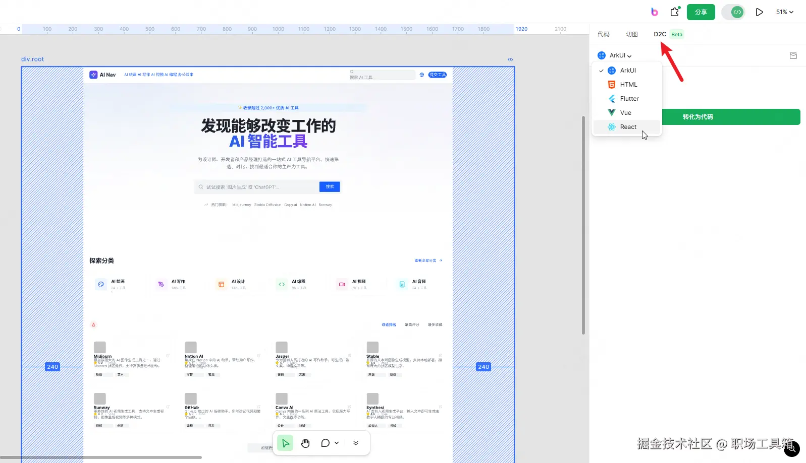 当你定稿后,系统能同步生成 HTML 或者工程化的 React 代码。设计师或者开发人员切换到代码视图,就能看到清晰的布局、样式变量。这种从设计到代码(D2C)的转换,真正打破了设计和开发之间的协作壁垒。