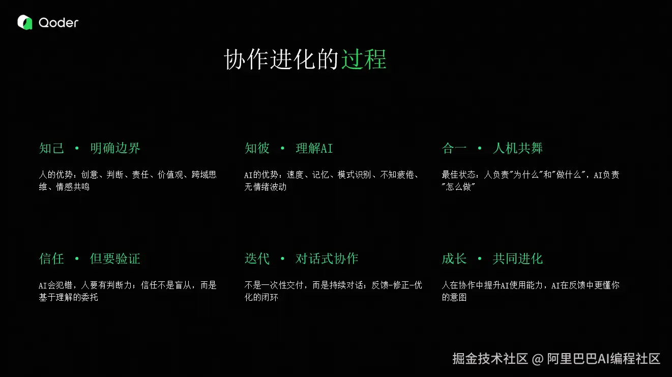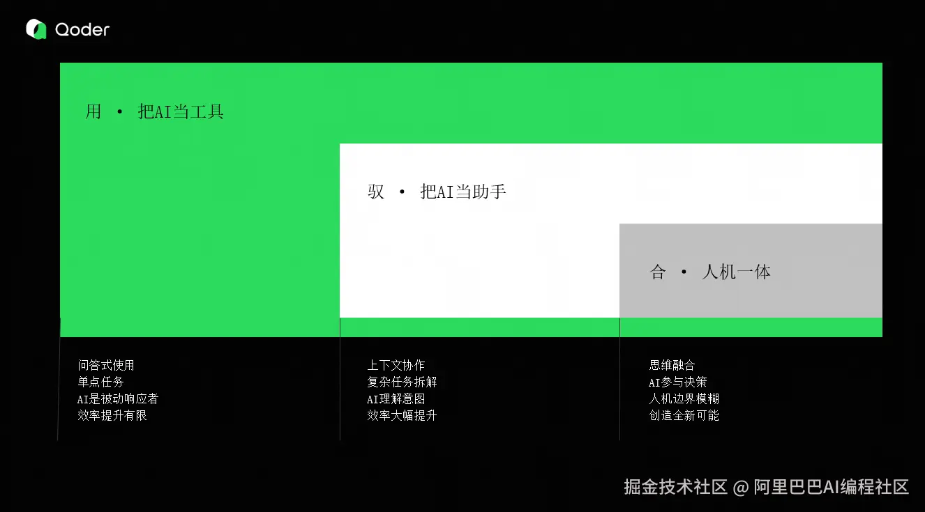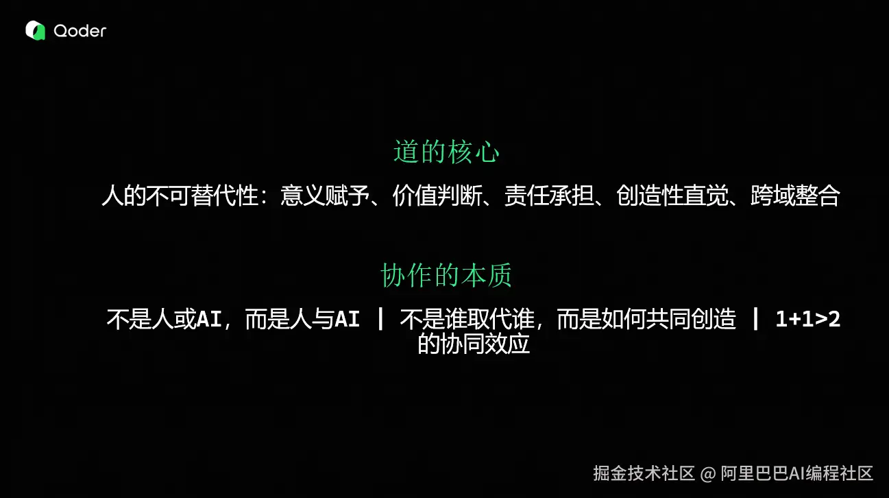 Qoder 目前支持上下文工程,你可以将上下文丢给 Qoder,让 Qoder 帮你分析,输出。还有就是复杂任务的拆解,呼吁大家都使用下 OpenSpec,让 Qoder 去拆解一些意图。我之前就是做产品经理的,可能吭哧吭哧要写一天时间,但 Qoder 只用五分钟就可以帮你拆解掉。 - 合·人机一体 理想的话就是每一个地方都有 AI ,让 AI 深度的去参与决策、执行,最终达到人机边界的模糊状态。开发者专注于高层次的决策和创新,而将具体的实现细节完全交给AI处理。
