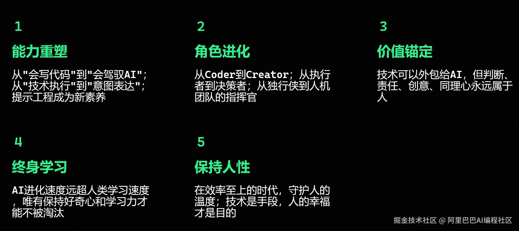 - 角色进化:从 Coder 变为 Creator,从执行者变为决策者,从独行侠变为“人机团队”的指挥官;