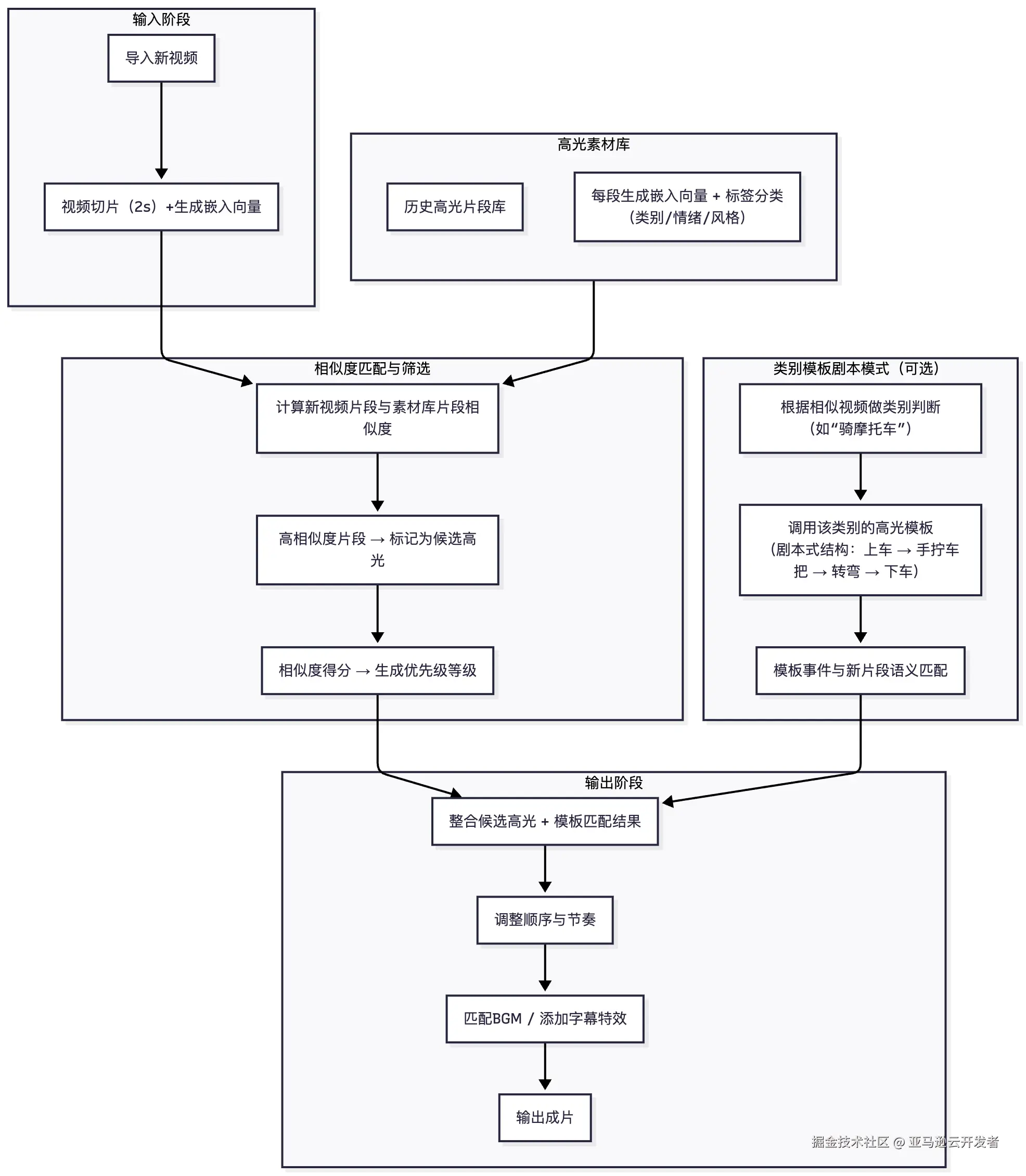 综上所述,本方案提出了一套利用AI进行视频高光剪辑的思路:从基本的纯大语言模型识别高光节点,到语义摘要+嵌入检索实现跨素材的检索和剪辑,并提供了随着素材积累逐步提升的思路。