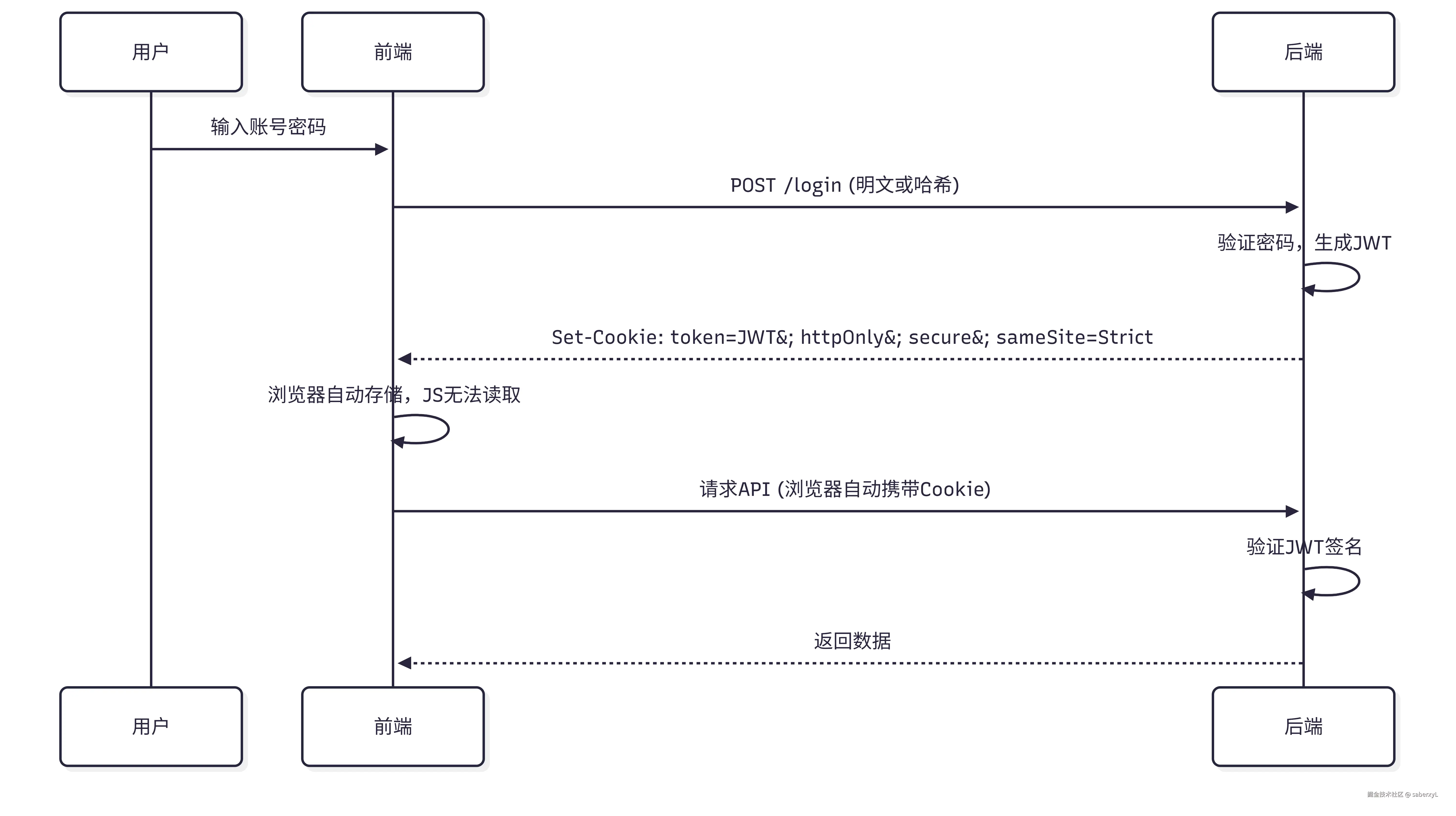 - ❌ Token返回给前端:应仅存httpOnly Cookie,前端无需知道