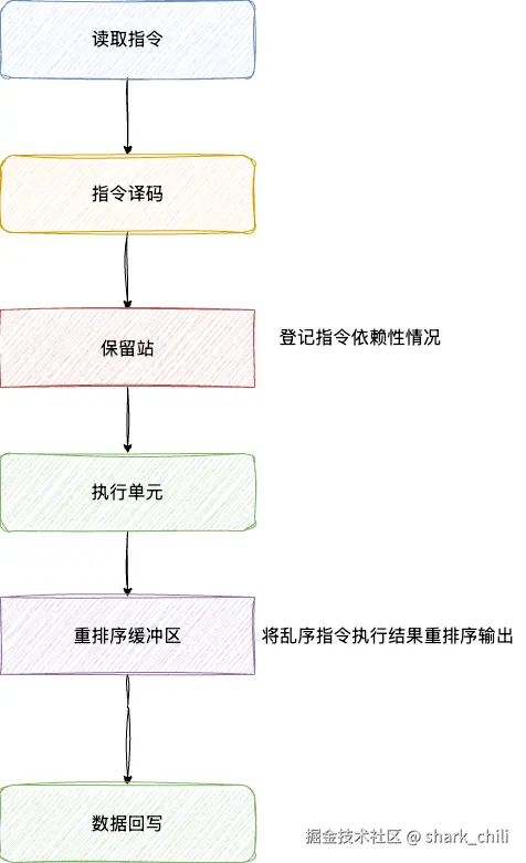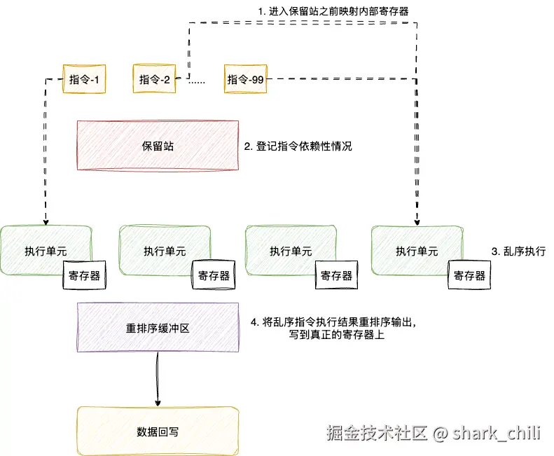 查看该指令是否存在依赖,只需在指令译码和alu执行单元之间加一层缓存我们称为保留站,在译码后通过这层缓存记录当前指令是否有依赖的数据?是否依赖硬件且硬件是否忙碌?需要读写的寄存器是哪些?通过这些信息将指令进行归类,执行单元就可以基于这些信息预先执行一些没有依赖性的指令,然后在指令重排序阶段将乱序指令结果重排序输出,从而提升cpu单位时间的吞吐量和利用率: