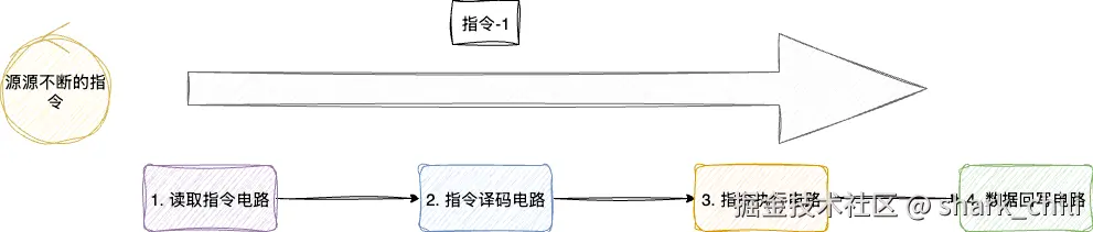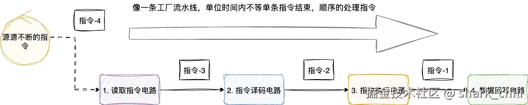 - 读取指令电路传递指令2,读取指令3,译码电路完成指令1解析,继续指令读取指令电路传递来的指令2