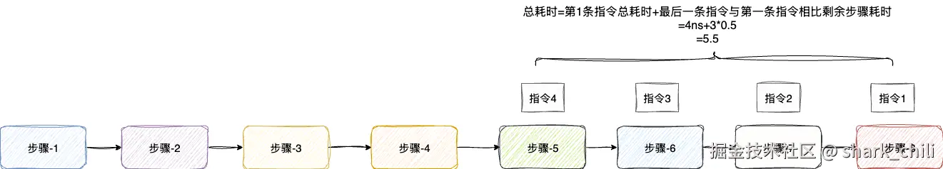 因为这三条指令是流水线方式执行的,所以在指令4执行完成之后,其它指令也就全部执行完成了,最终耗时约为7ns。相比于完全的串行执行(16ns),性能提升了约56%。