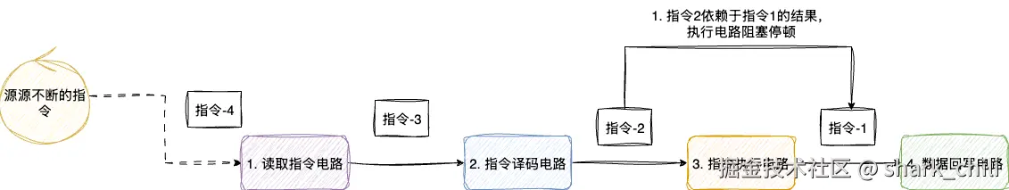从CPU微观的角度来说,这就是一种串行的、单位时间内未能充分利用电路单元的流水线设计:
