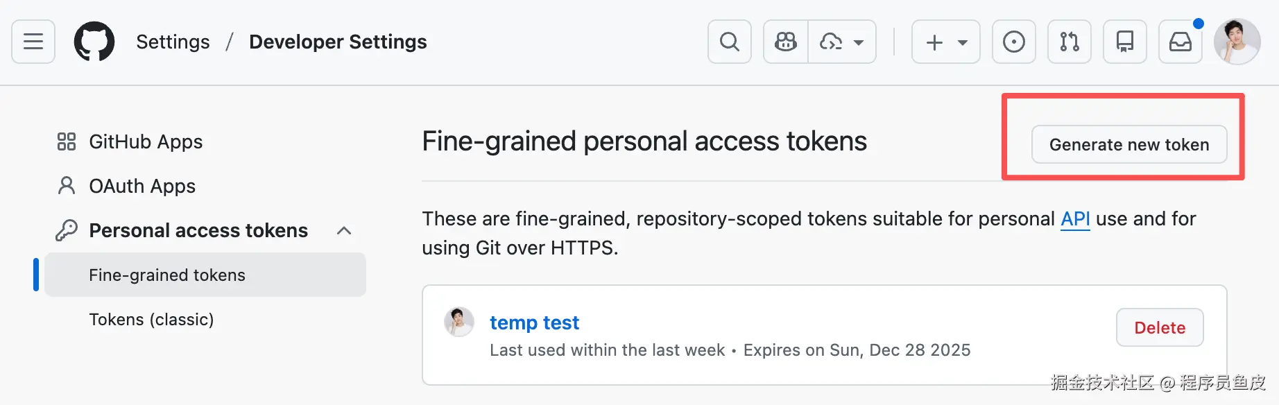 可以在 GitHub 上生成一个新的 Token:
