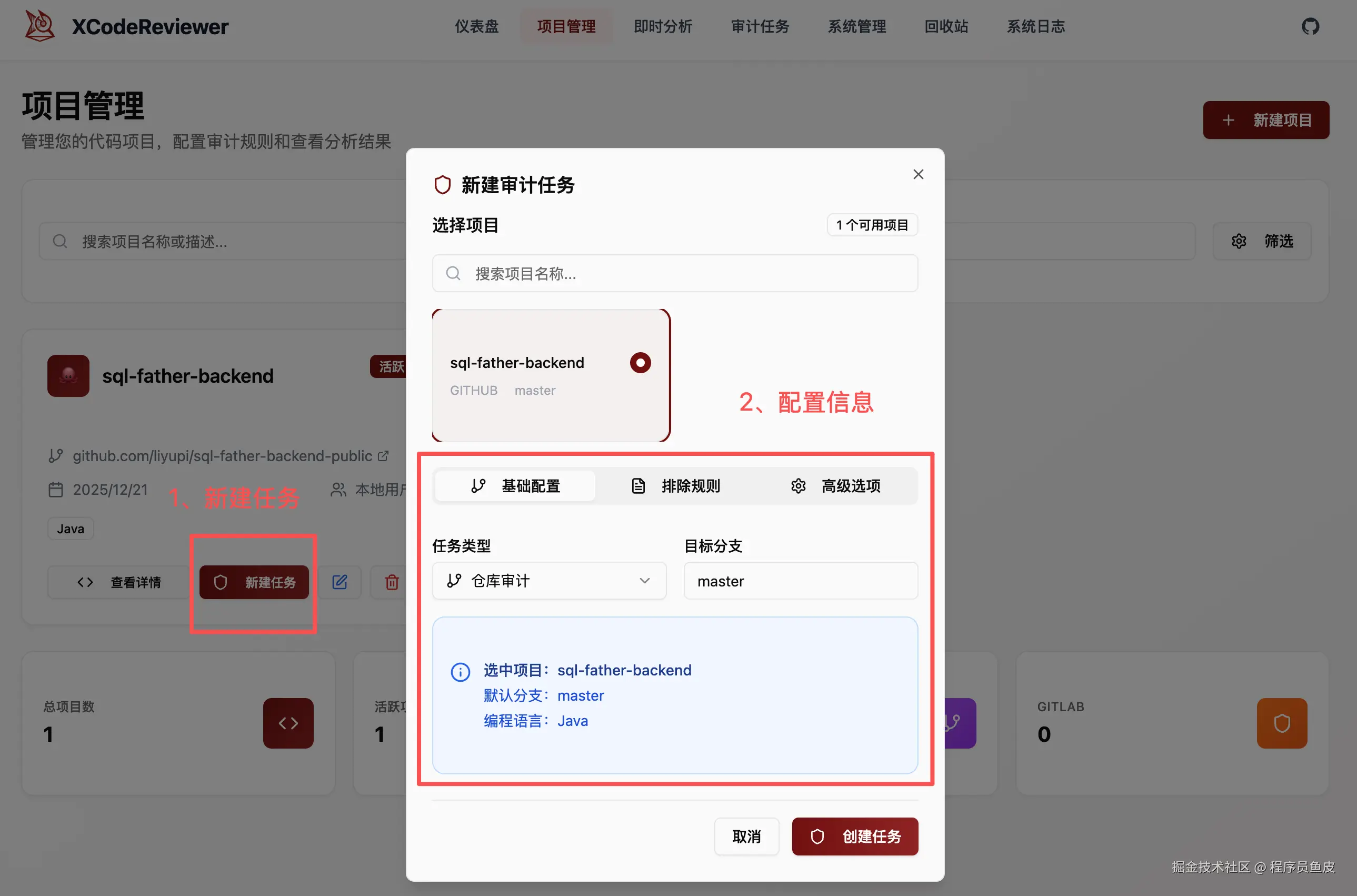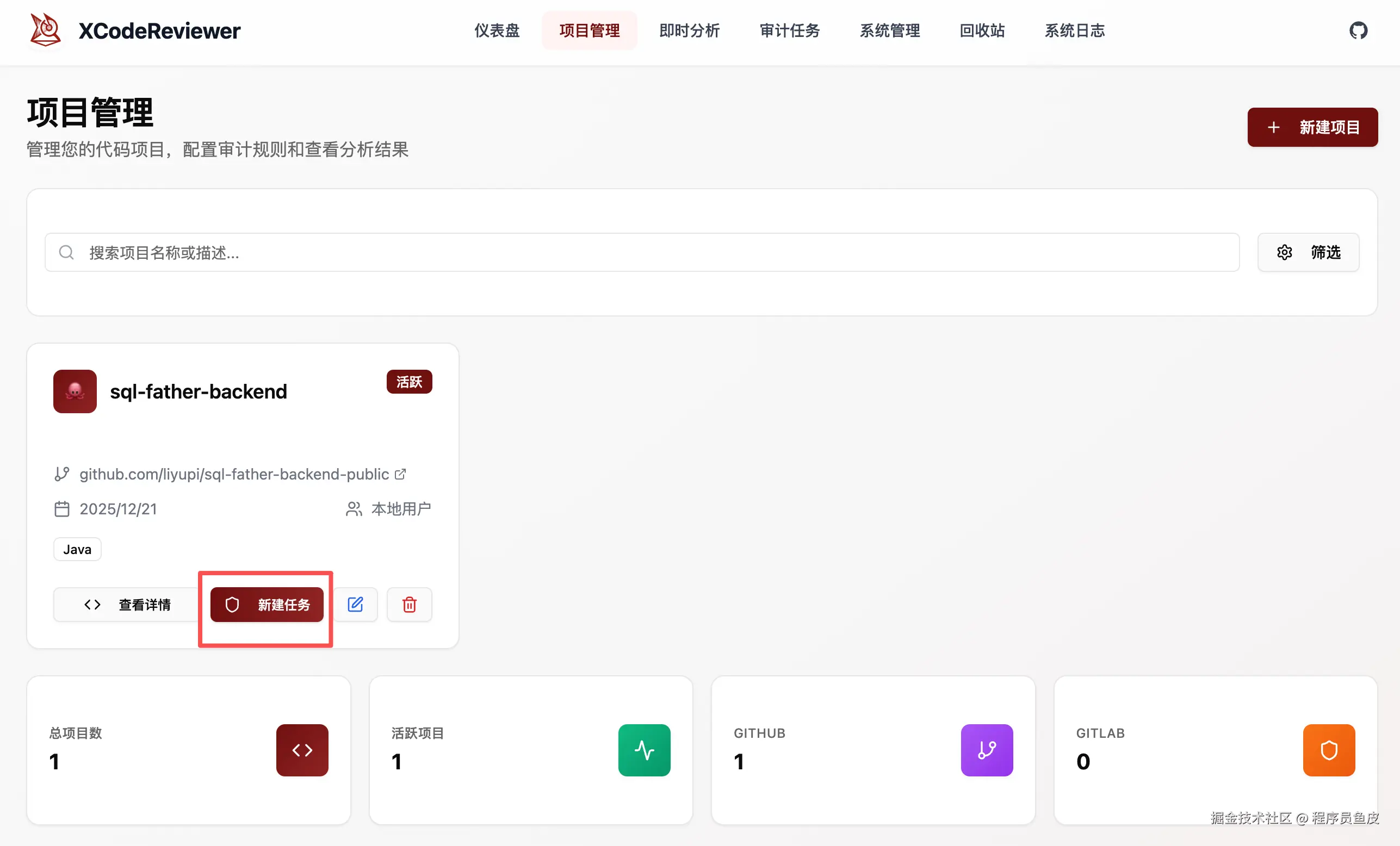 配置好之后,就可以创建一个要分析的项目了,仓库地址要填写正确。这里鱼皮拿自己 3 年前做的个人开源项目 —— SQL 代码和数据生成器试试水。