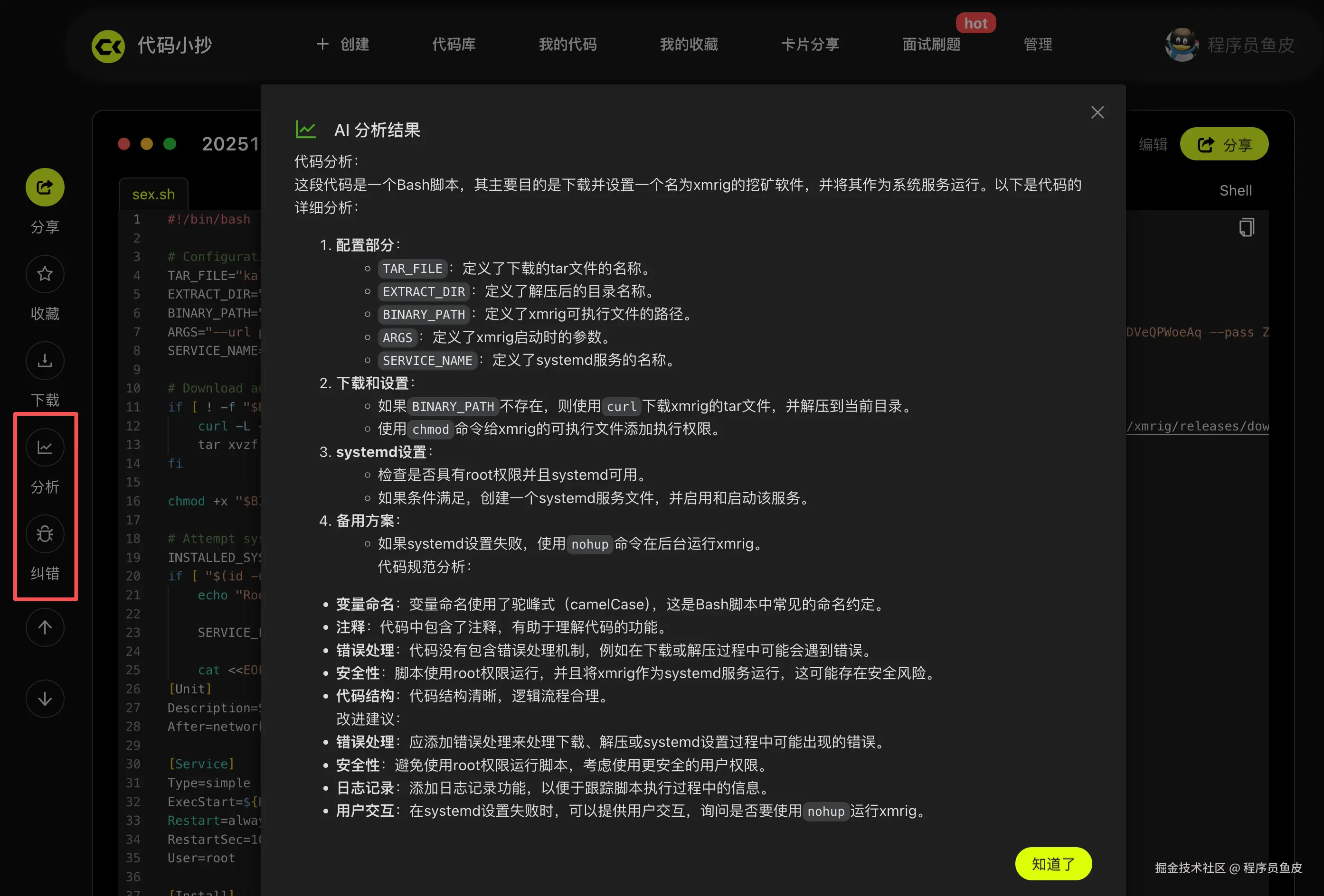 除了项目审计,作者还提供了即时分析功能。不过这个就没什么新意了,我们团队的 代码小抄在 24 年初就已经上线了这个功能。