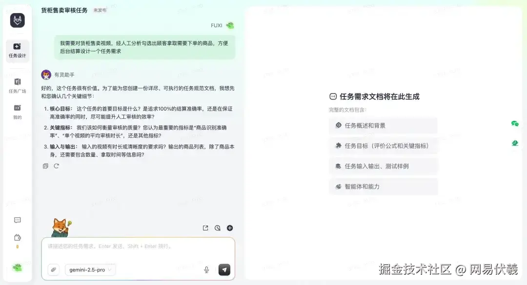 现在,在有灵智能体上,你只需要像和同事聊天一样,在对话框里输入你的核心诉求,无论是“设计自动售货机商品视觉审核任务”,还是 “搭建用户行为数据采标体系”,哪怕只是一个模糊的想法,系统都能逐步挖掘关键信息,让复杂的任务定义像聊天一样行云流水。