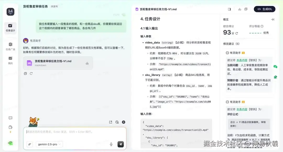 - 自动生成:基于交互内容,快速生成一份涵盖任务背景、目标、关键指标、输入输出规范及代码示例的专业任务文档。