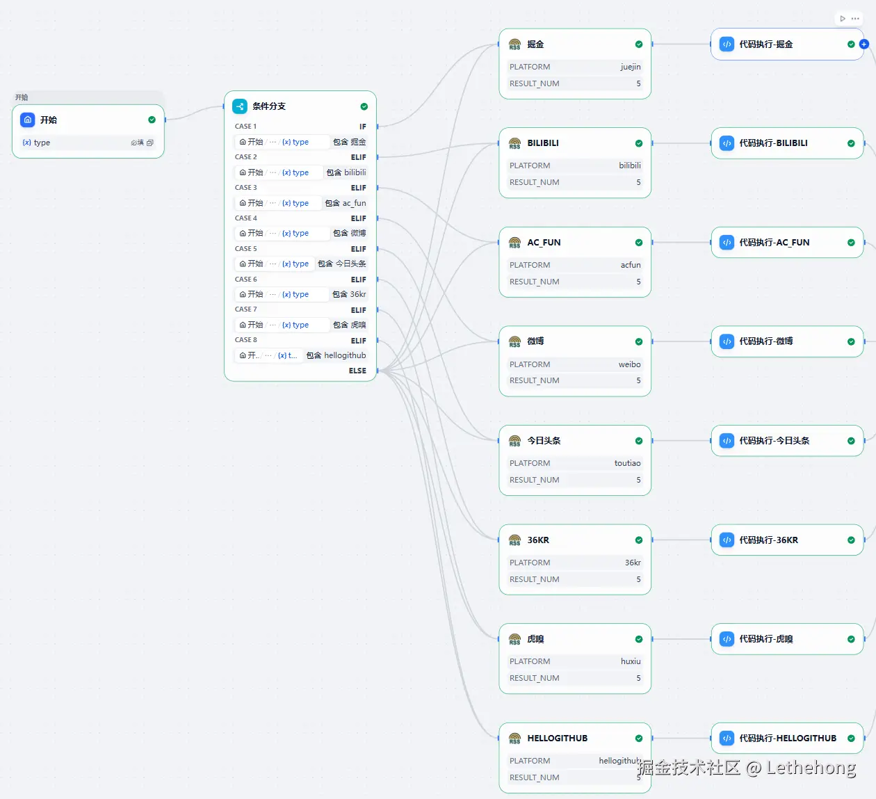 条件分支用于判断当前运行需要处理哪个平台的数据,举例判断字段 platform 的取值:"juejin", "bilibili", "weibo",或者 "all"。每个分支会把 arg1(原始 JSON)丢给对应的解析脚本或同一解析器的不同适配器。