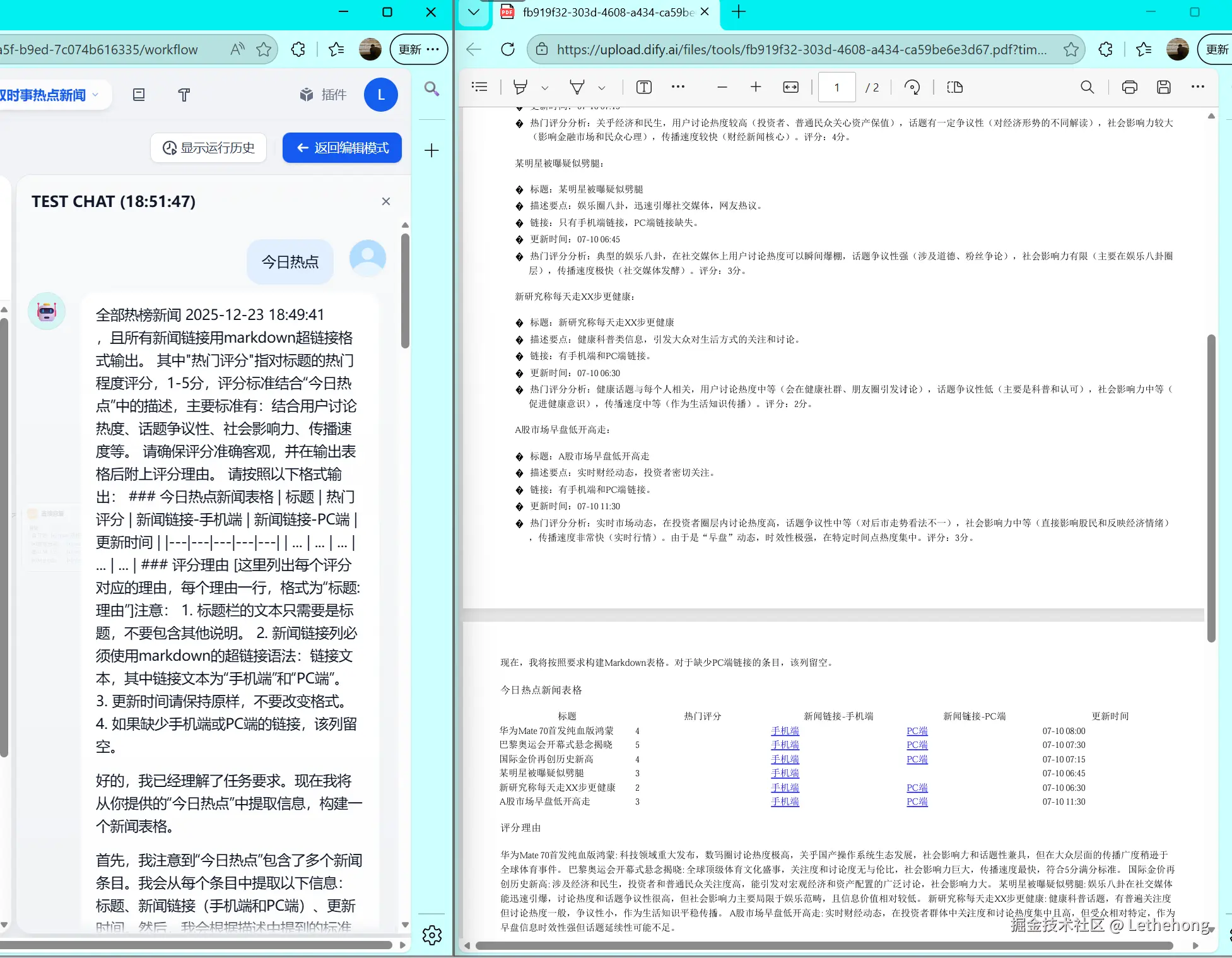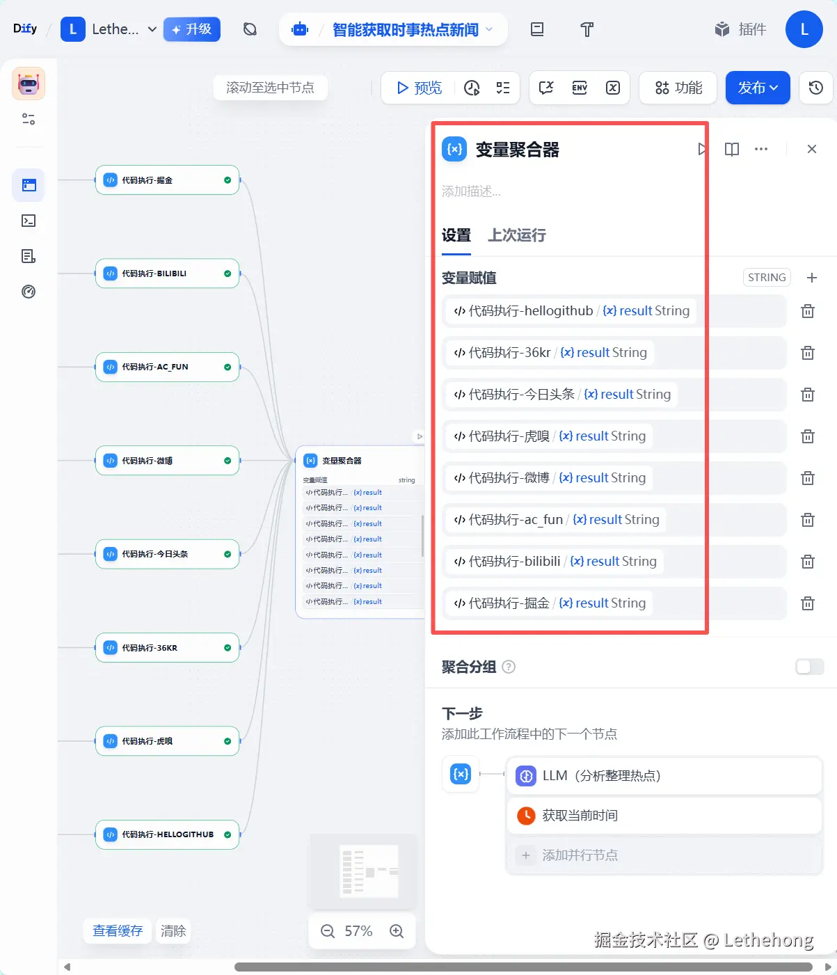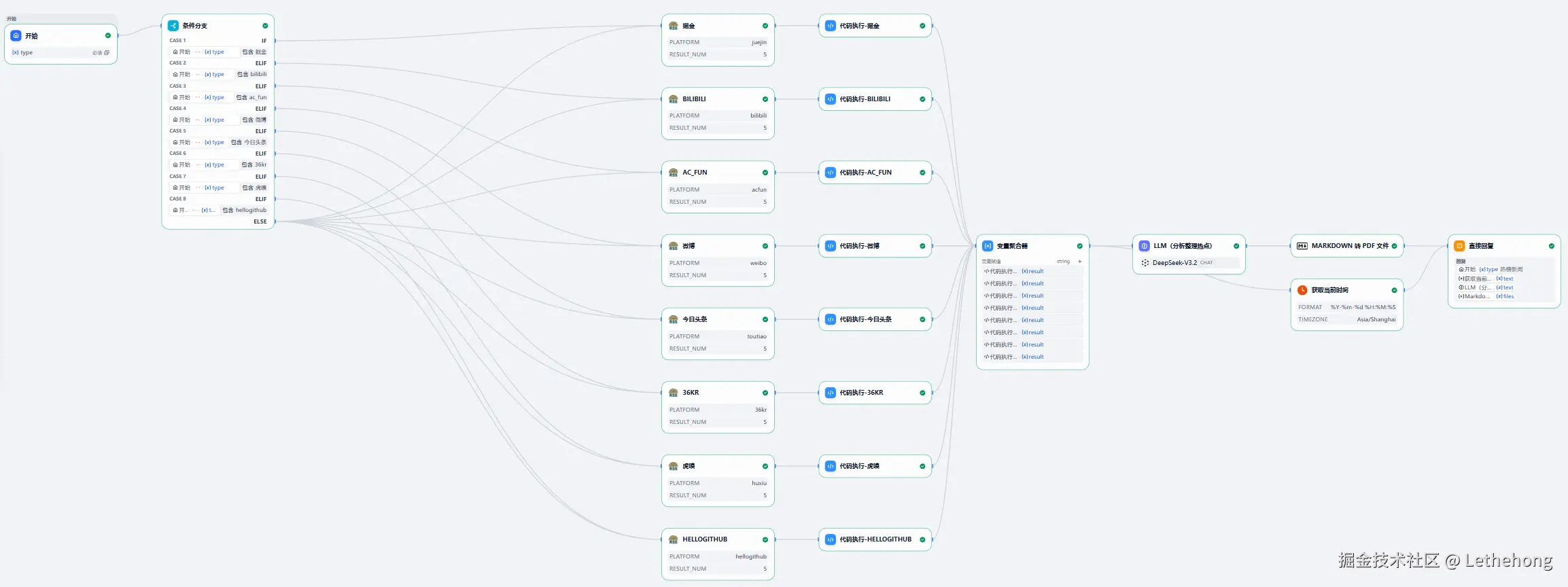 在信息高度分散的时代,热点内容散落在掘金、B 站、微博、今日头条等多个平台,人工整理成本高且标准不统一。本文基于蓝耘MaaS和Dify实战搭建一套多平台内容聚合与大模型自动总结的工作流方案。通过统一解析各平台数据结构,将结果交由 LLM 自动生成结构化热闻摘要,并支持 Markdown / PDF 输出。整套流程覆盖数据采集、平台解析、变量聚合、模型调用与结果交付,可直接复用与扩展。适用于每日热闻汇总、舆情监测及自动化内容运营等实际场景。
