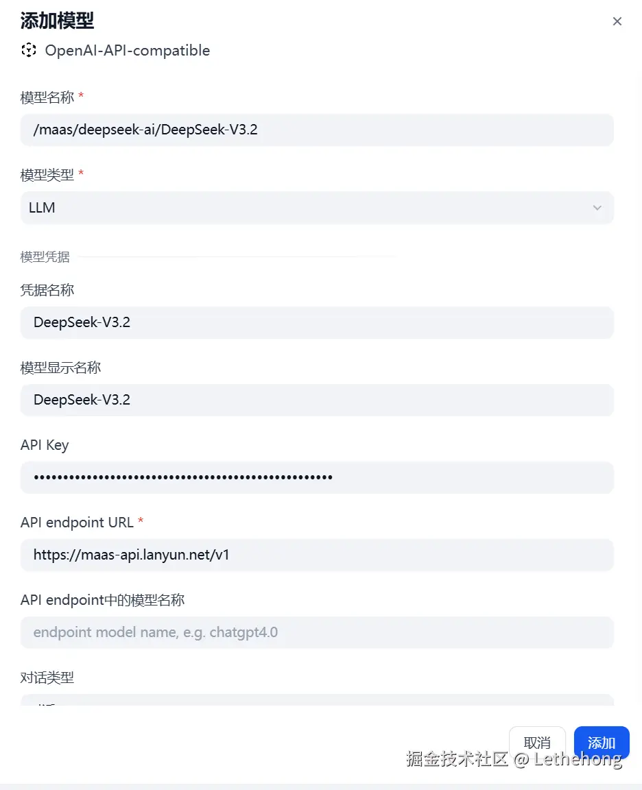 在本文的实战中,我们选择兼容蓝耘MaaS平台的 OpenAI-API-compatible 供应商进行配置,正是利用其兼容 API 的模型部署与推理能力——无需自行搭建底层算力或模型服务,只需将整理好的数据发送给模型,即可获得分析与生成结果。