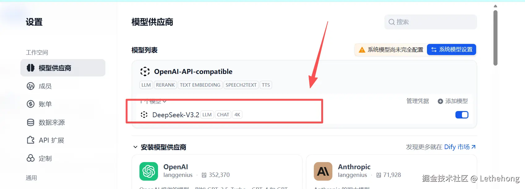 - 点击右上角头像 → 设置 → 模型供应商(Model Providers)→ 选择