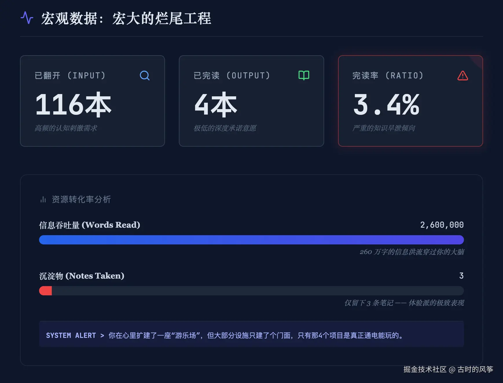 好家伙,读了116本,读完了4本,写了3条笔记,怪不得AI说我极度功利呢,确实大部分是工具书。