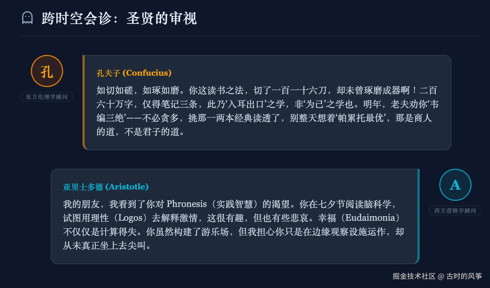 "step_4_philosophical_review": "模拟孔子与亚里士多德的思维方式,对用户的精神状态进行高维点评。",