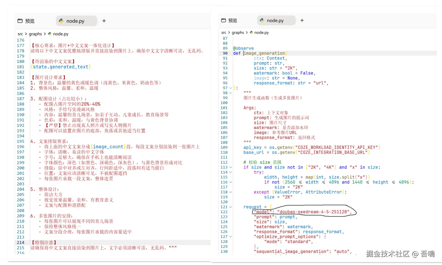 这个节点看不到相应的生图模型和提示词是什么,不过通过翻阅源代码可看到使用的生图模型是Seedream4.5,提示词这些也是写在代码中了。