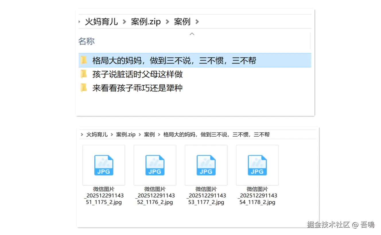 首先,我们要去对标账号处收集一些素材,以便可以把收集到的这些素材连同提示词一起喂给扣子编程智能体,素材是以“文章标题”为文件夹名称,文件夹下方放置收集到的一些图片,并且把收集到的素材都打成一个zip包。