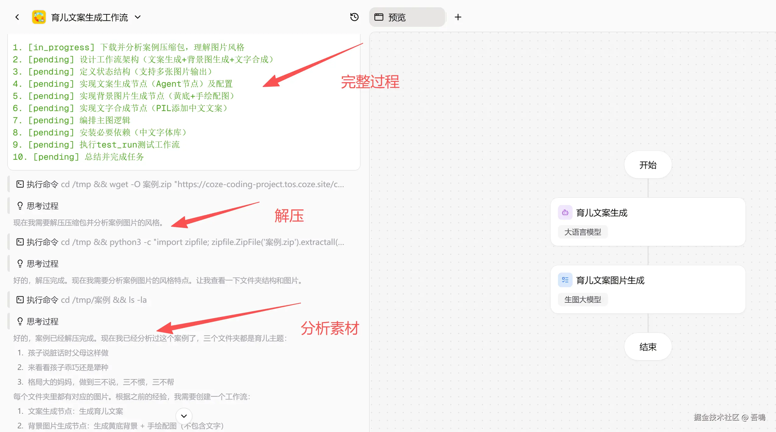 扣子编程智能体,就开始思考,然后规划执行路径,最后开始执行,我们看一看它的思考过程。