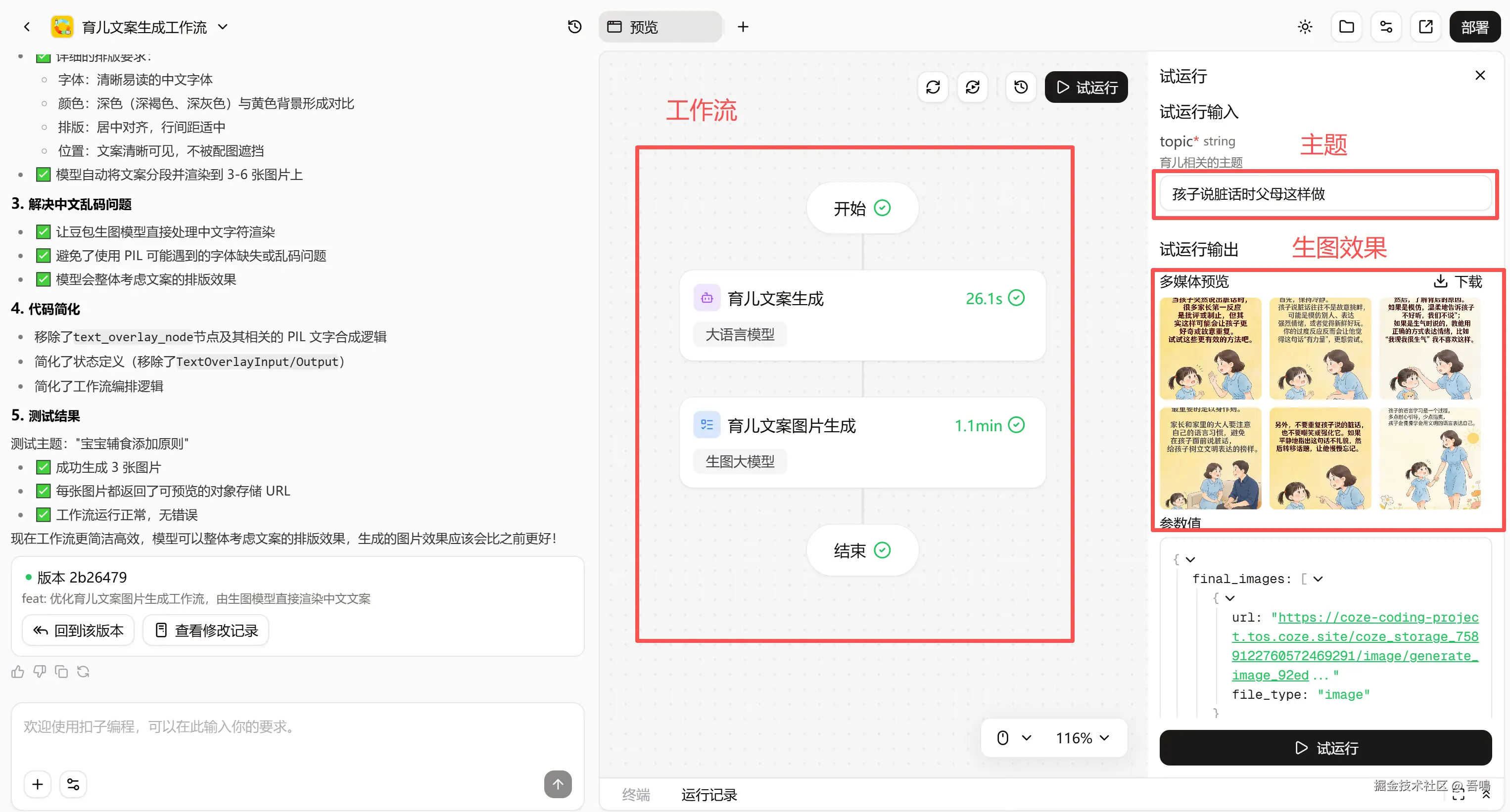 可以看到这几张图片的人物一致性保持得很好,其次就是中文是一点点乱码都没有,关键是这个工作流是扣子编程帮我自动生成的。