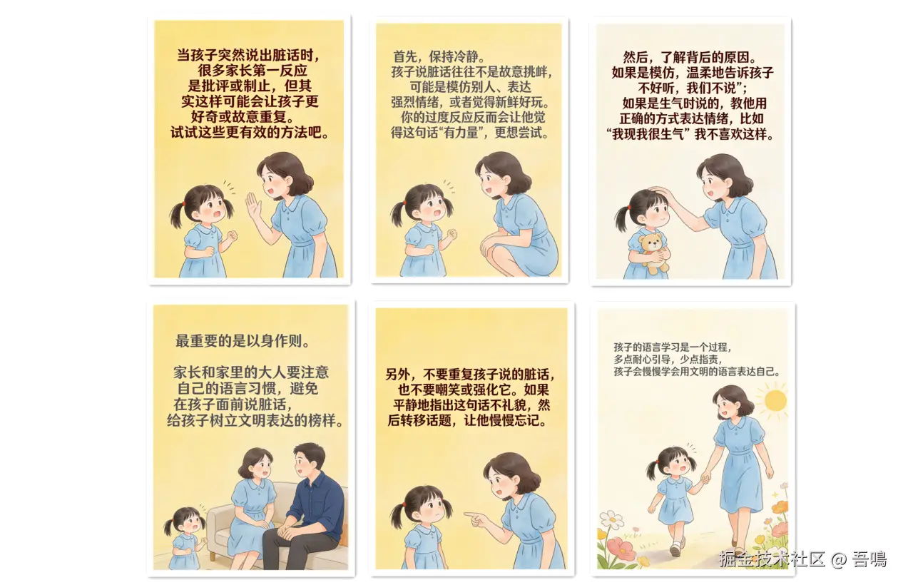 本文我要分享的是怎么样使用扣子编程,把这个育儿漫画给复刻了,在讲解具体的实现过程之前,我们先来看看扣子编程自动帮我实现的工作流以及工作流出图的效果。