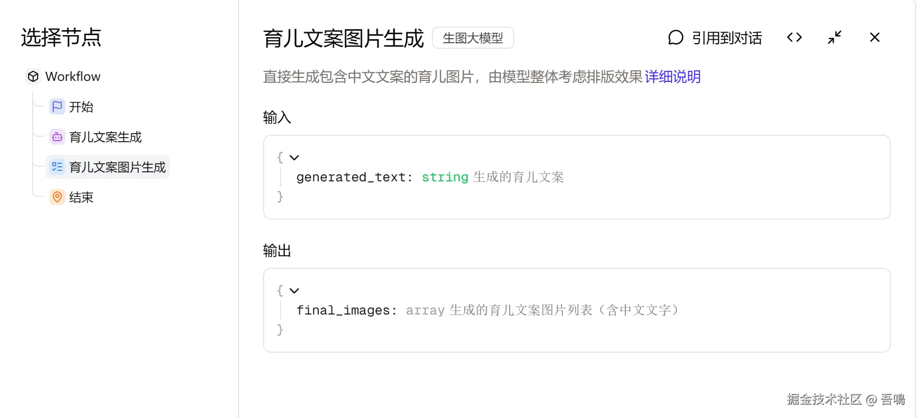 这个节点就是用来生成育儿漫画图文的,接收一个育儿文案主题,然后生成相应的漫画图文。