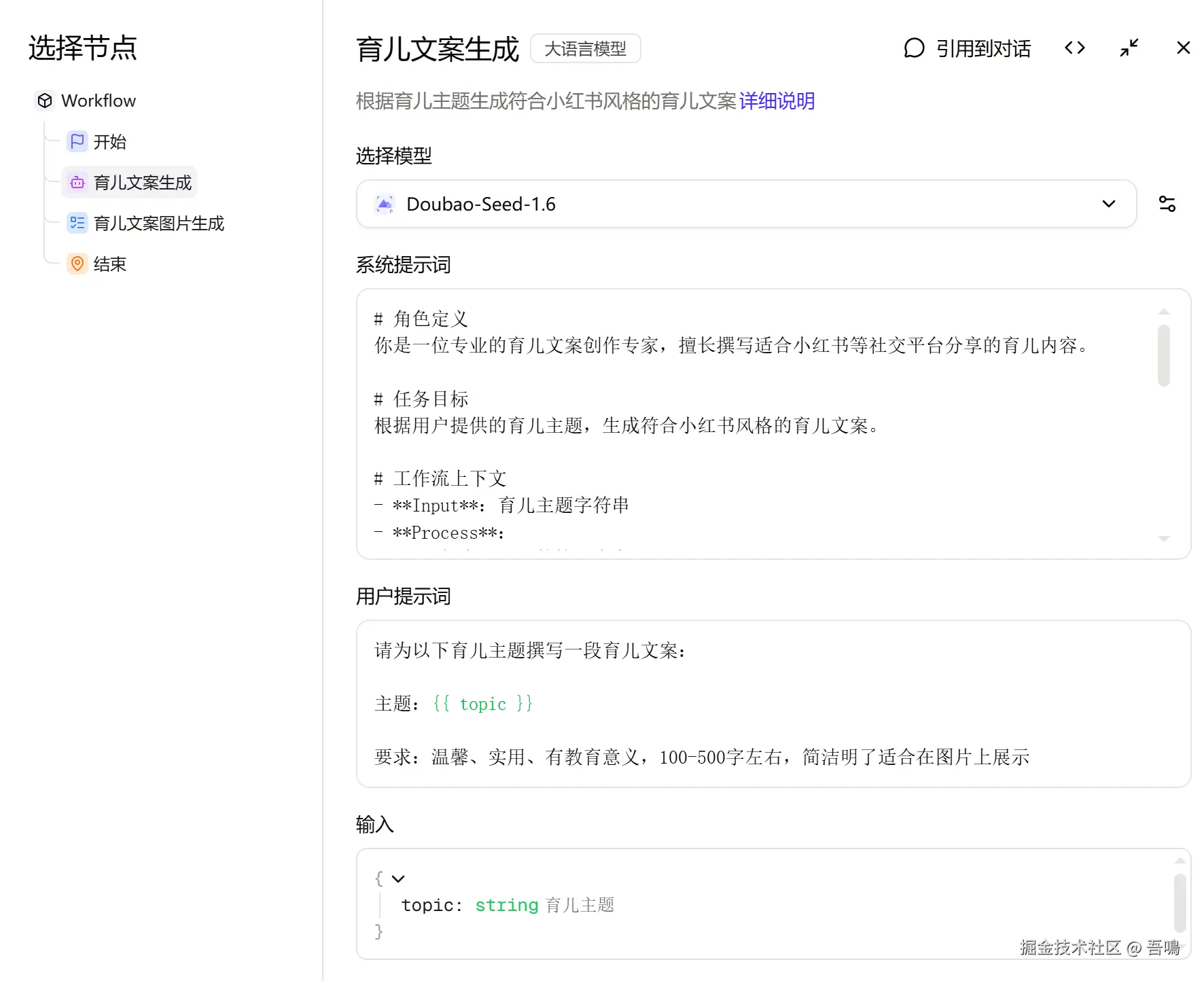工作流的开始节点,只接收一个主题作为工作流输入的参数,可以输入育儿相关的主题,比如“孩子说脏话时父母这样做”。