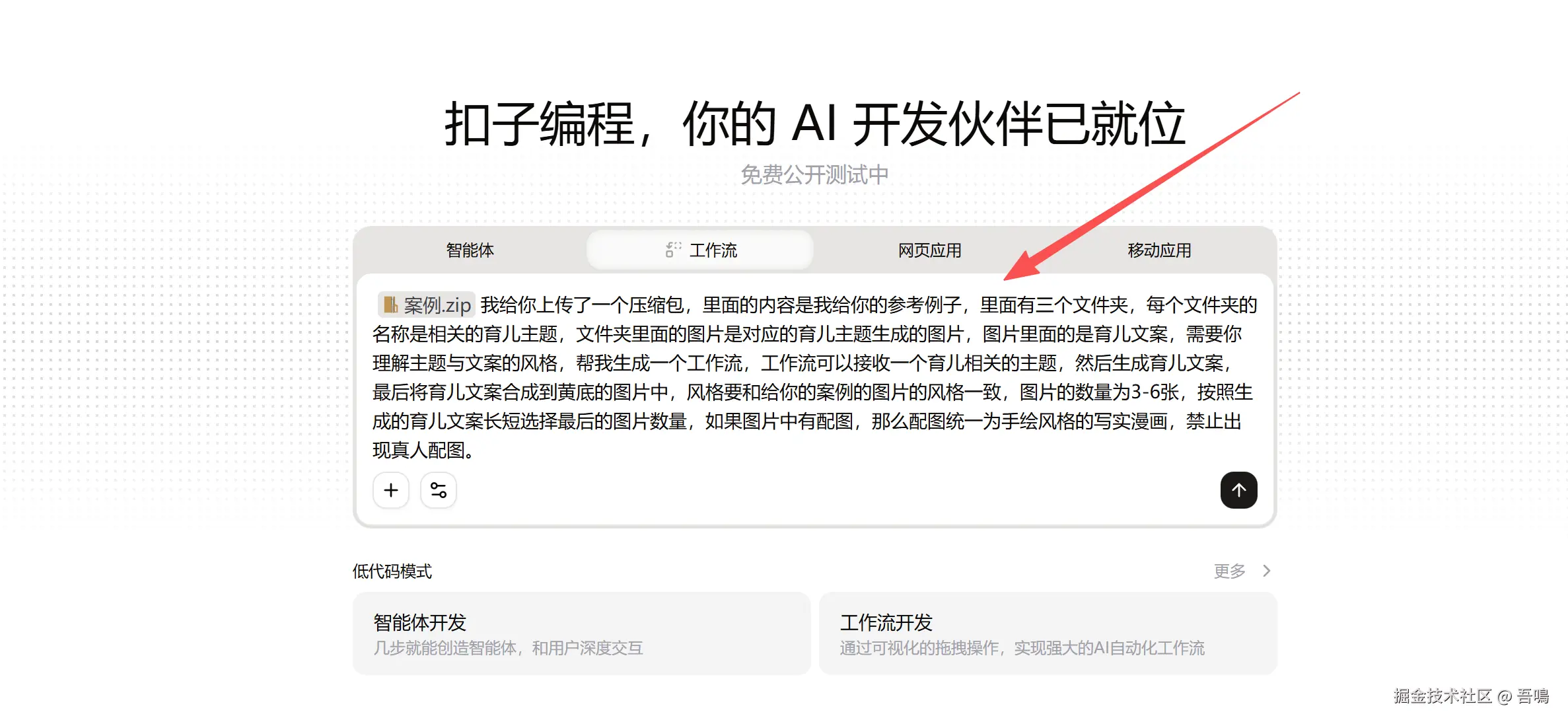 然后,我们去到扣子编程的首页(code.coze.cn/home),选中“工作流”,把你采集好的素材上传给扣子编程智能体,并且输入咒语,然后点击提交。