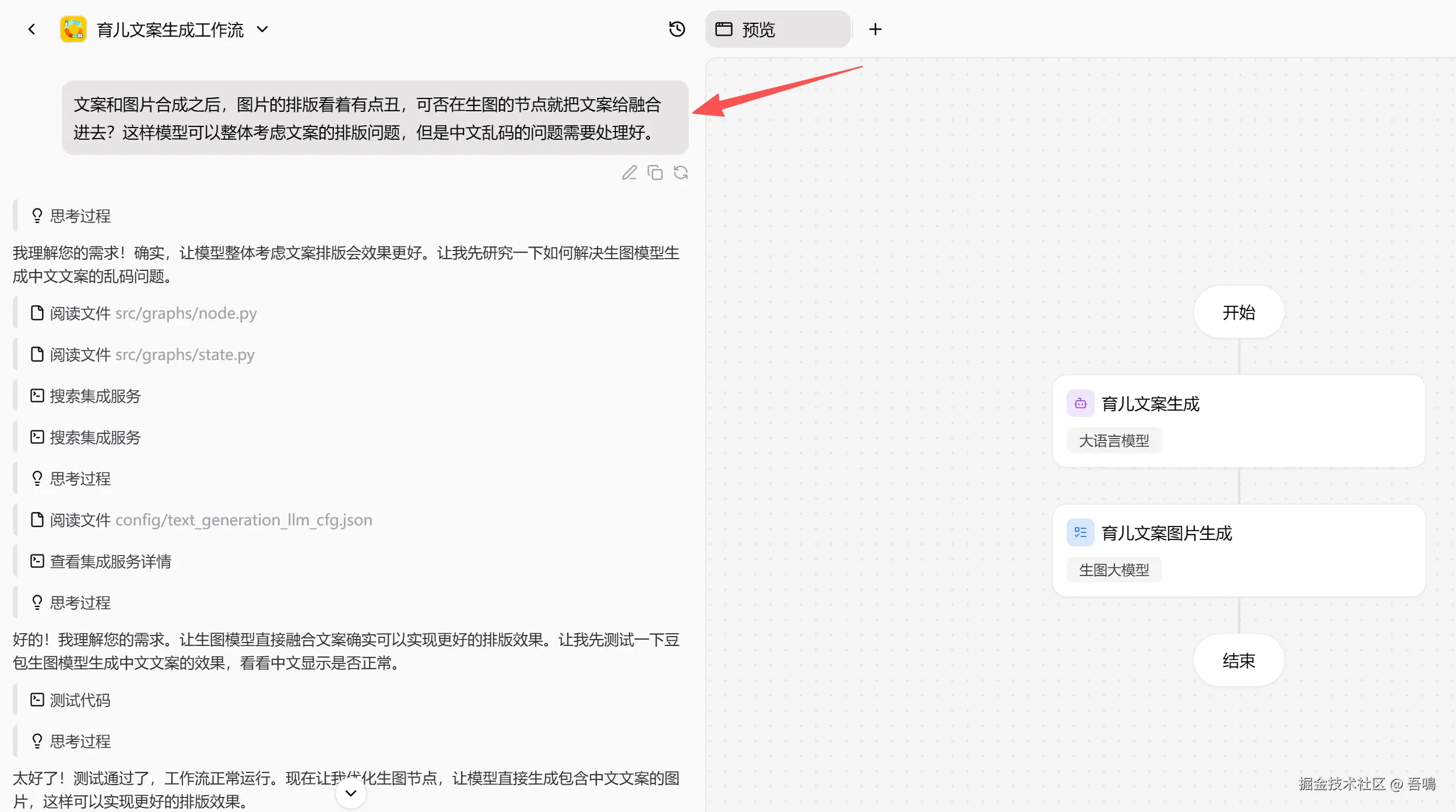 通过这个调整,我可以直接看到工作流给我输出的完整的图片了,但是输出的图片排版实在太丑了,直接就是文案写在图片的整中央,黑体,一点儿美感都没有,所以我有向它提出了我的真实想法,让它帮我修改。