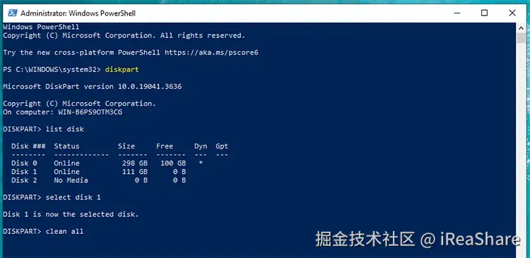 步骤 5: 输入“ clean all ”并按“ Enter ”。这将通过在所选驱动器上写入零来安全地擦除所选驱动器上的所有数据。