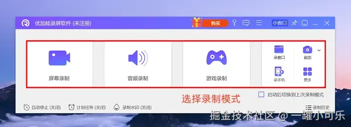 - 到数据蛙官方网站下载并安装软件,打开后按自己的需求选录制模式,要是用来录会议,选 【屏幕录制】 模式就可以;