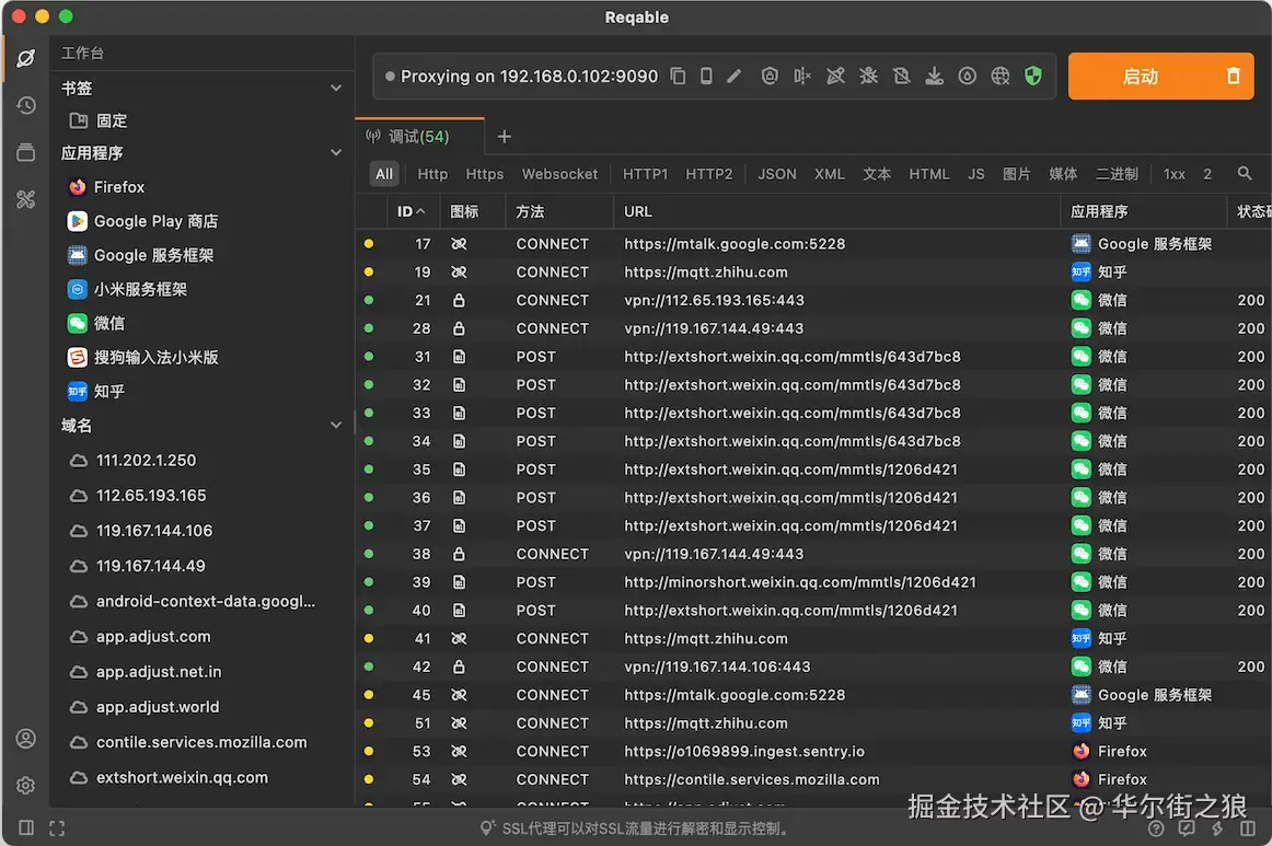 首先,需要启用Reqable的调试功能,点击最右上角的启动按钮进入调试状态。在调试状态下,任何HTTP请求经过Reqable的MITM代理服务器都会显示到界面上。