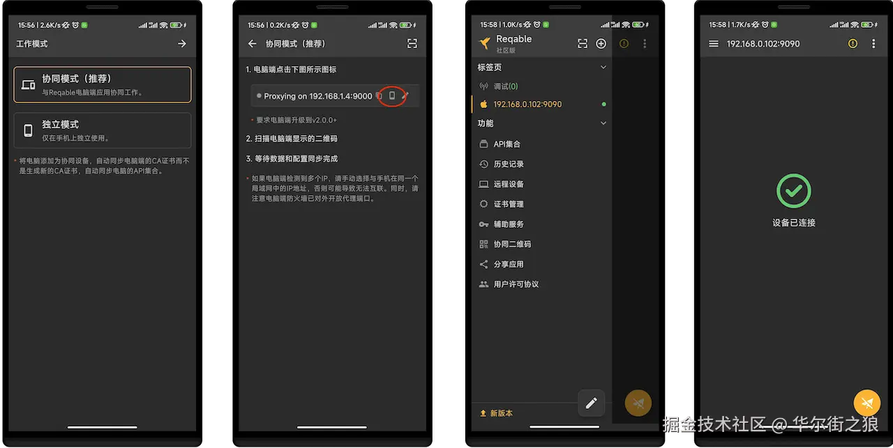 - 协同模式:手机端流量转发到电脑端Reqable进行分析和实施各种调试操作。