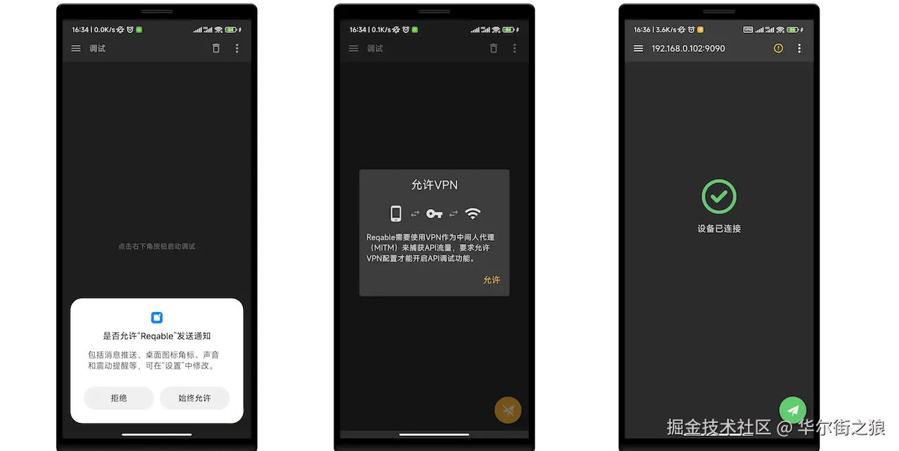 最后,点击右下角的调试按钮,允许通知和VPN服务,进入调试模式。