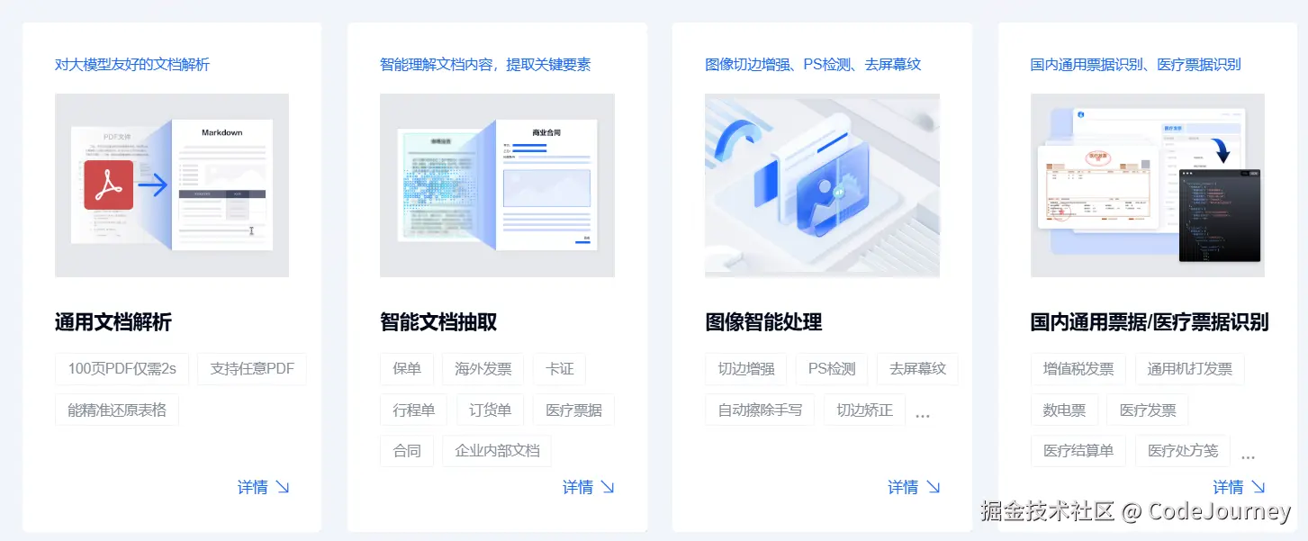 我们使用 TextIn 大模型加速器 的 通用文档解析 API(或智能文档抽取 API)完成文档 OCR 与信息抽取。