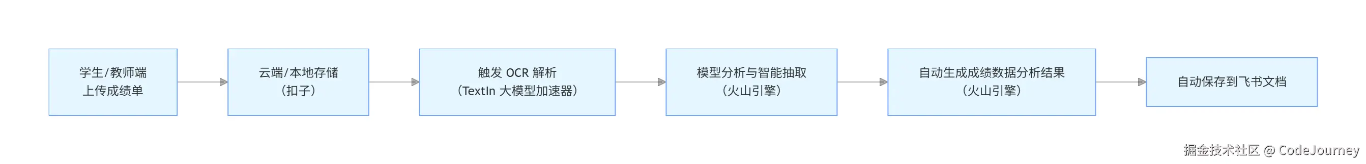 最终,火山引擎生成标准化 JSON 或表格数据,进行统计和分析,并将成绩分析结果或回写至飞书文档,实现端到端的自动化处理。