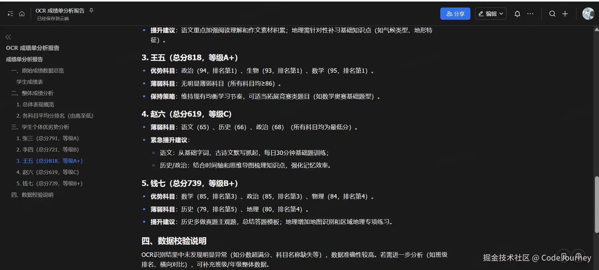 从落地角度来看,这套方案带来的最大价值并不只是“省时间”,而是改变了成绩单的存在形态——它不再是一次性查看的静态文件,而是可以被持续分析、持续积累、持续复用的教学数据资产。无论是班主任的班级诊断、教务部门的教学质量评估,还是后续更大规模的教育数据分析,这种基于 TextIn 大模型加速器 × 火山引擎 构建的智能体范式,都具备很强的通用性与扩展潜力。