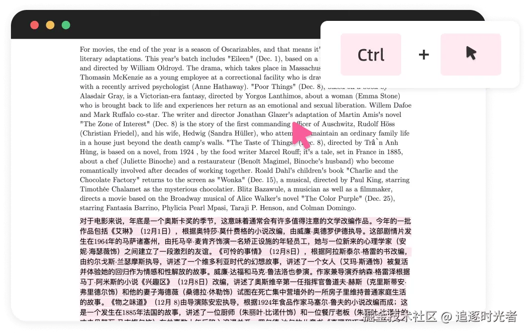 沉浸式翻译支持鼠标悬停翻译,你只需将鼠标悬停在任意段落,同时按下预设的快捷键(如 Ctrl),当前段落的译文便会立即呈现在段落之后。