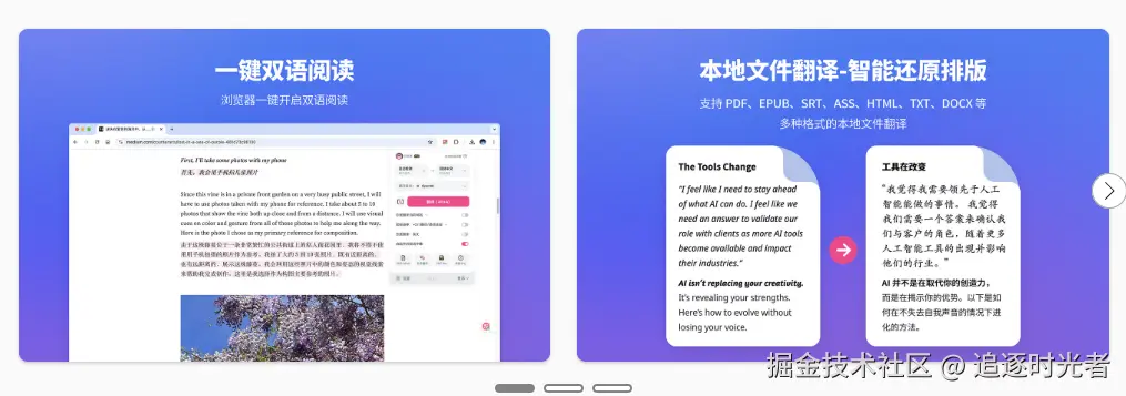 - 电子书阅读:将外文电子书转化为双语版本,提升阅读体验。