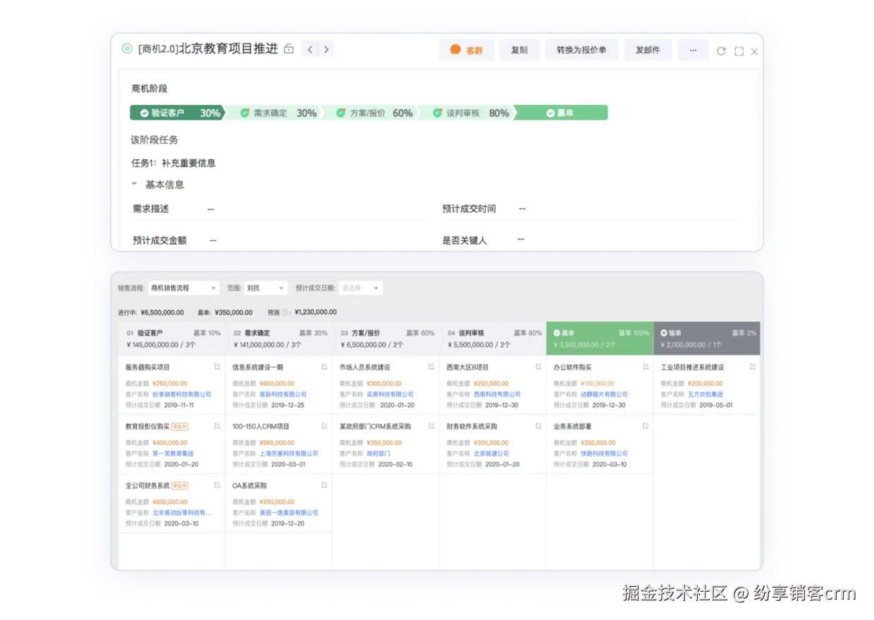 - 新人速成,老兵进阶:对于新人,标准化的商机阶段任务(SOP)就像一本详尽的通关攻略,告诉他们每个阶段该做什么、说什么、提交什么材料,极大地缩短了摸索期,降低了试错成本。对于资深销售,系统沉淀的历史数据和成功案例库,是他们复盘战术、优化话术的智慧锦囊,帮助他们从凭经验向凭方法论转变。