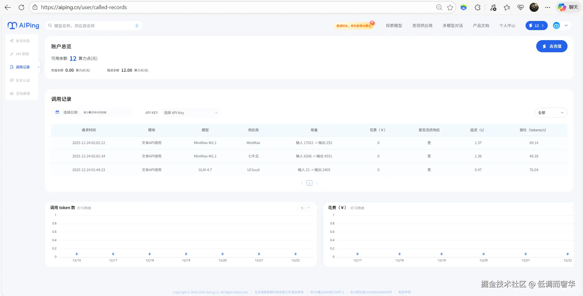 5、AI Ping后台查看可视化调用记录与费用