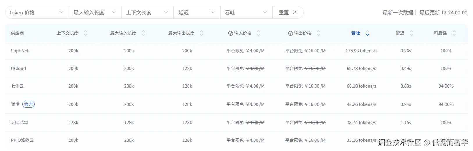 GLM-4.7 各供应商中,SophNet 的吞吐(175.93 tokens/s)与延迟(0.26s)表现最优,上下文 / 输入 / 输出长度均达 200k 且可靠性 100%;UCloud 吞吐、延迟次之;七牛云、智谱(官方)可靠性略低(94%);无问芯穹上下文长度仅 128k 但可靠性拉满,PPIO 派欧云各项指标相对偏弱;当前平台均提供免费额度,输入 / 输出价格一致。